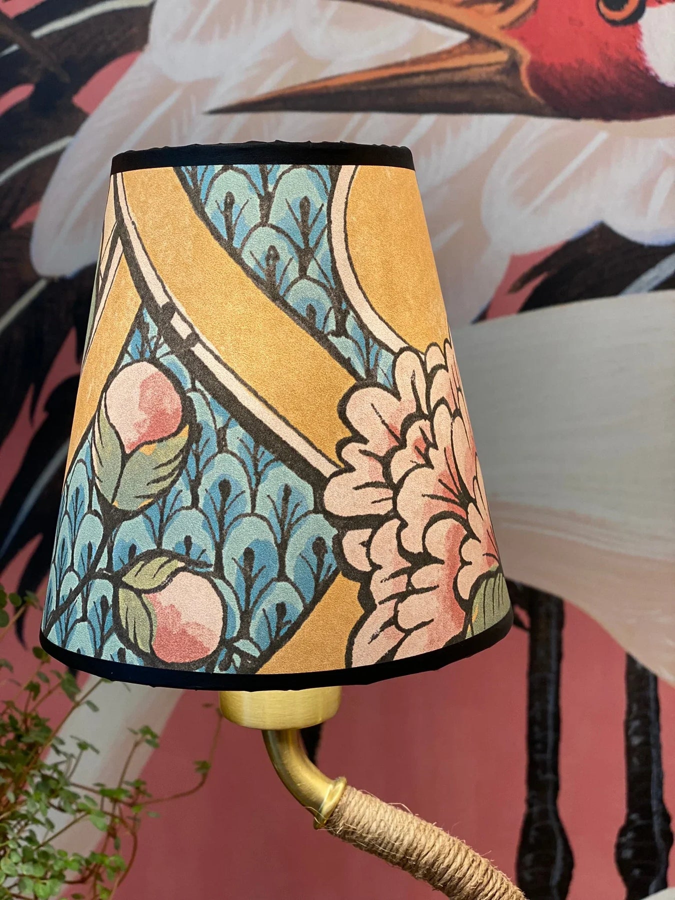 Handcrafted from Gucci Floral wallpaper, this lampshade showcases a vibrant blend of intricate patterns and delicate details. Featuring elegant florals, soft pastel tones, and gold accents, it embodies sophistication and artistic flair. Finished with a gold interior and black trim, this shade adds a luxurious yet playful touch to any space, making it a true centerpiece for your home.