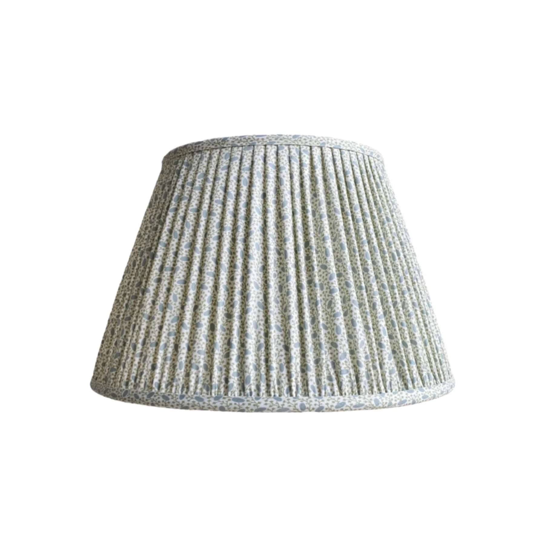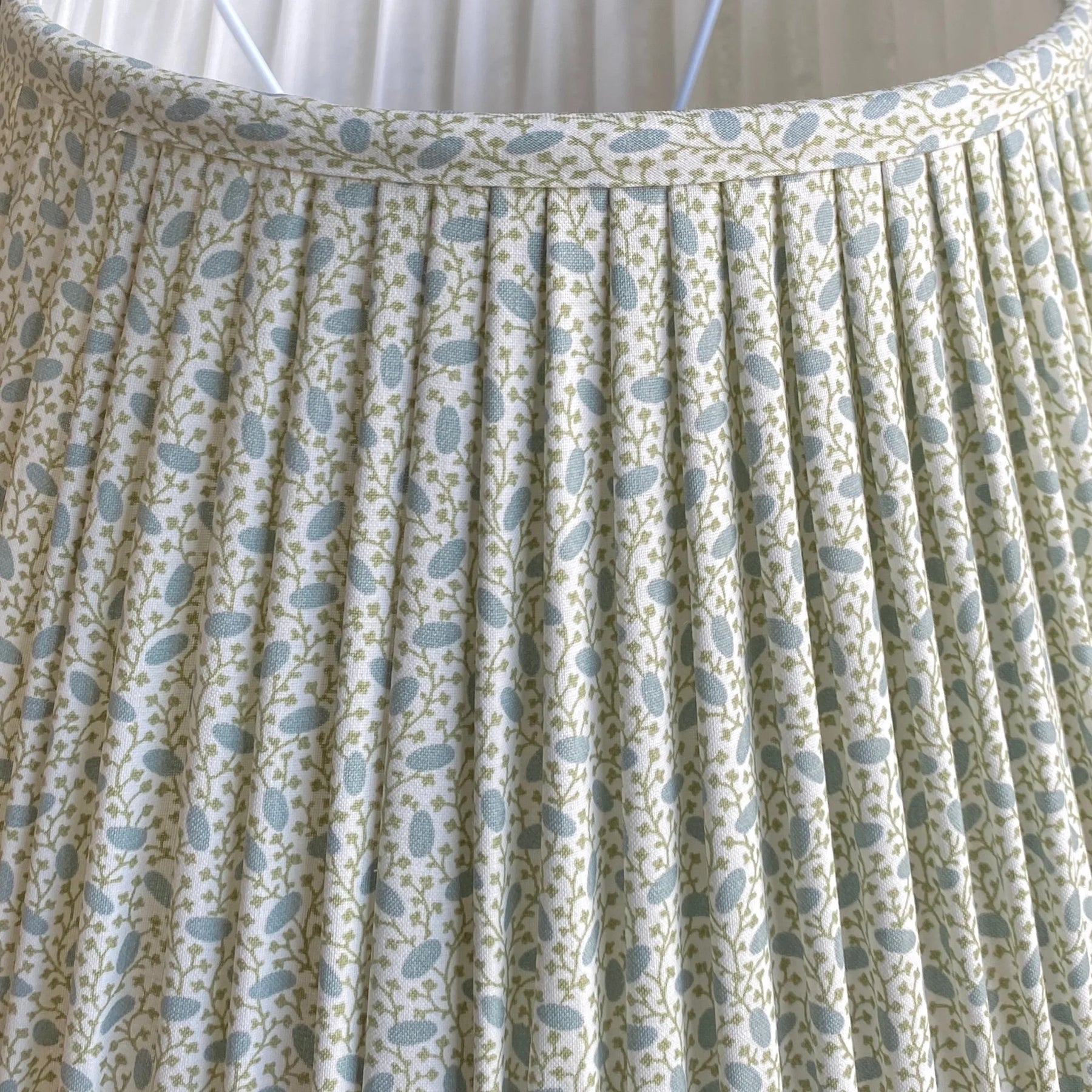Enlarged from a tiny fragment of 19th century patchwork, Ian Sanderson's Pinto design has a modern twist. Printed in muted blue and green on off-white 100% cotton, each classic empire shade is printed, pleated and gathered by hand in England.