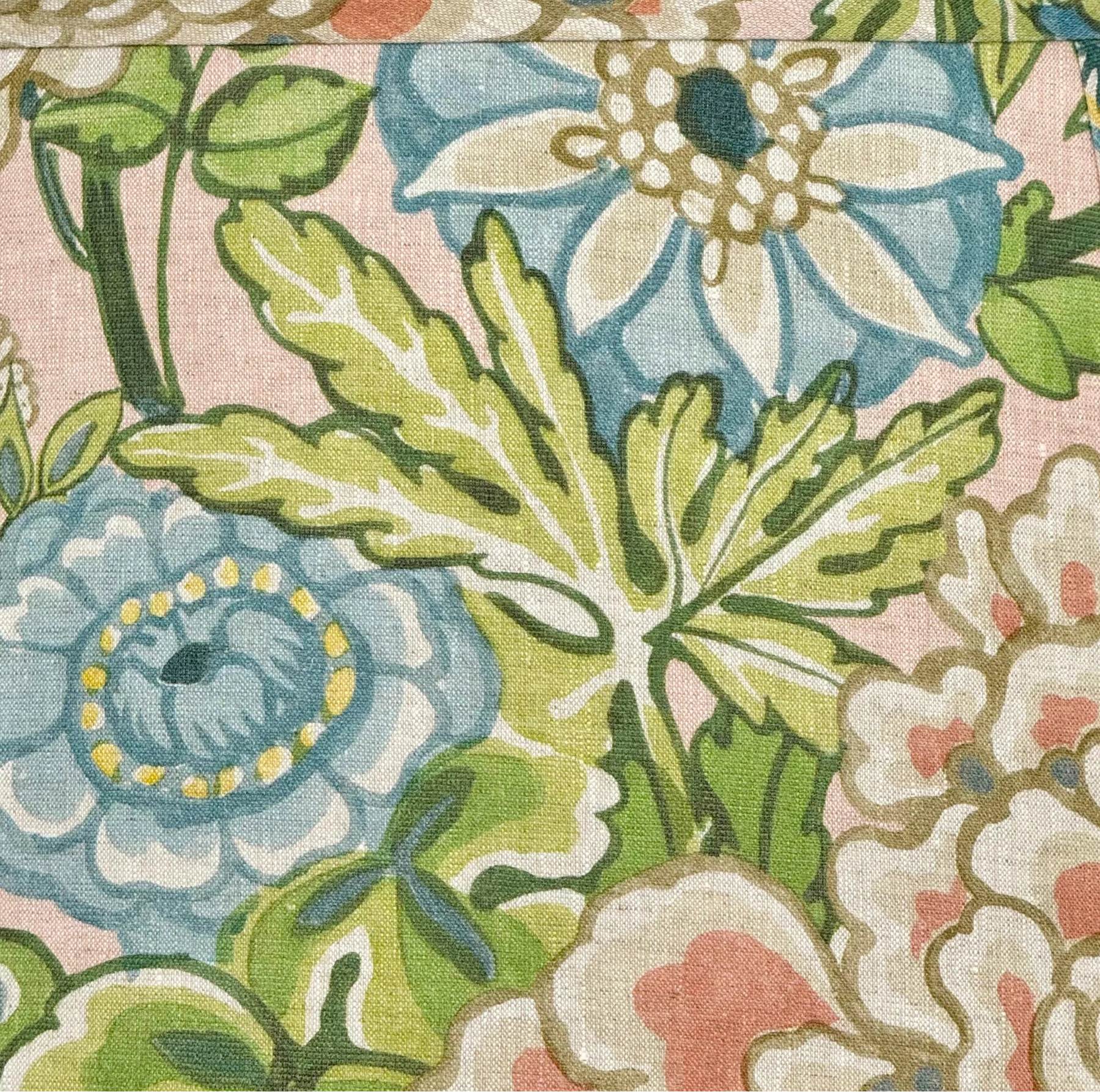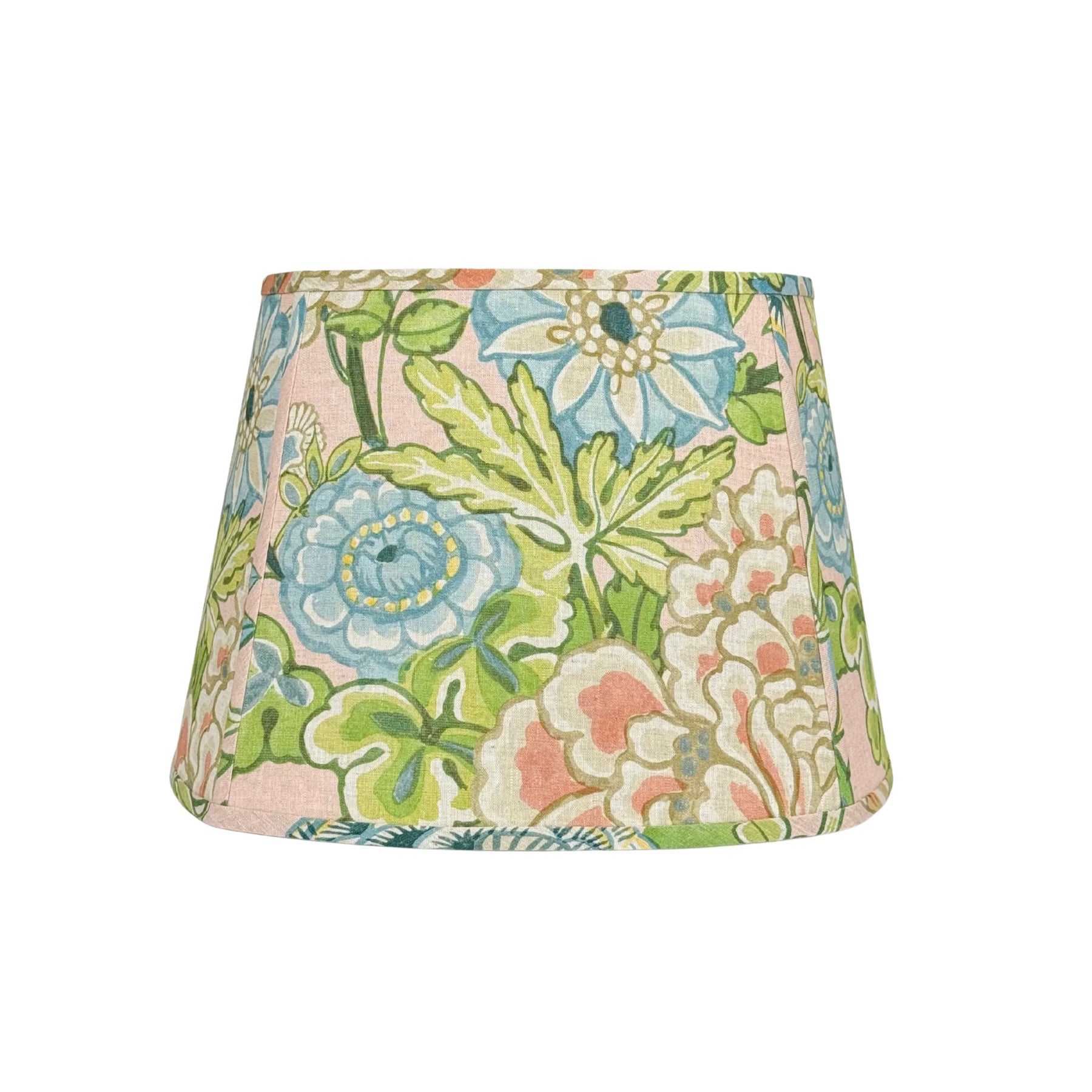 Handmade using Thibaut's Peony Garden in Blush, this lampshade features a lush, stylized watercolor garden of fanciful peonies boldly outlined for a vibrant, graphic feel that bursts with color. Soft pink, coral, and blue blooms layered with warm gold create a look that feels lively, fresh, and full of personality.