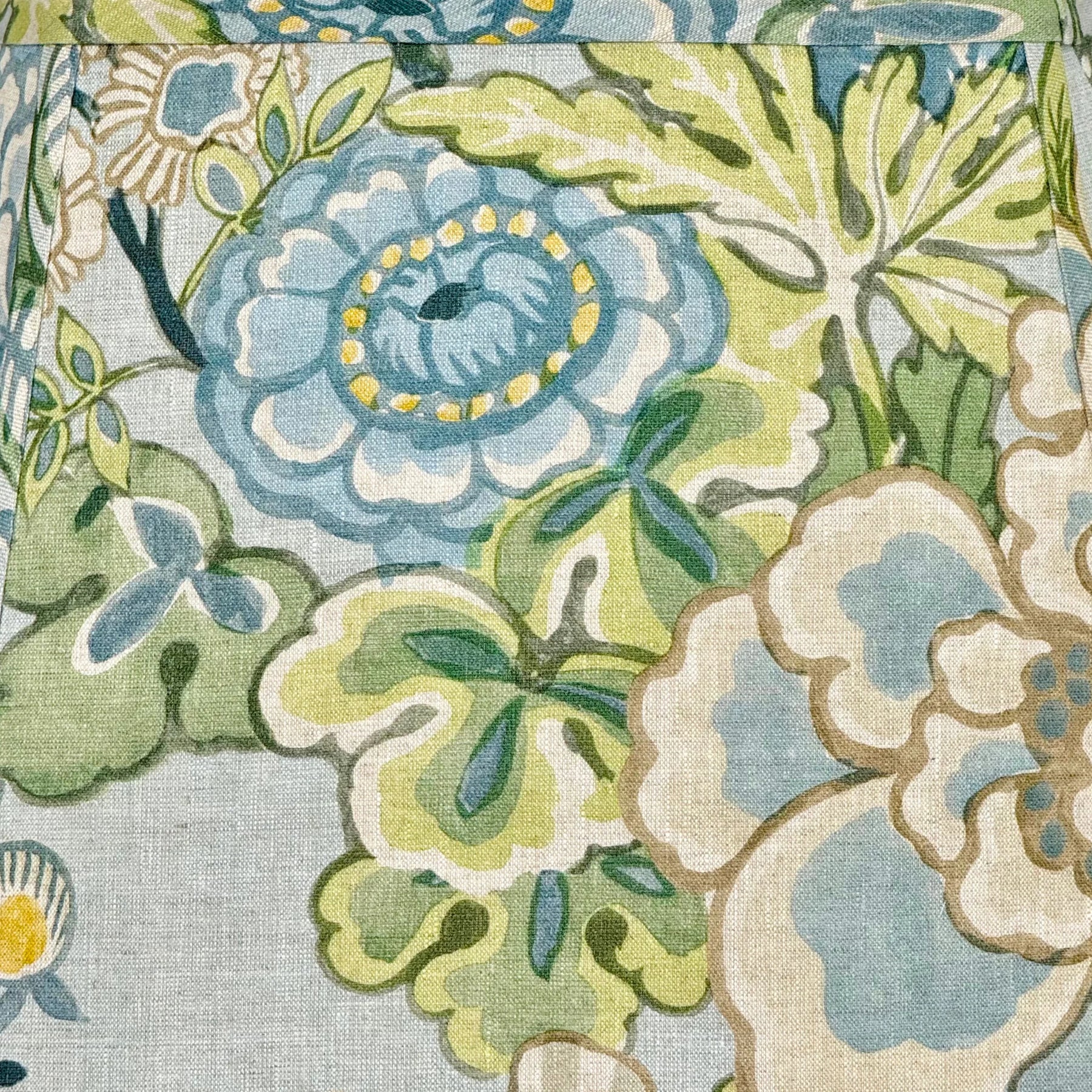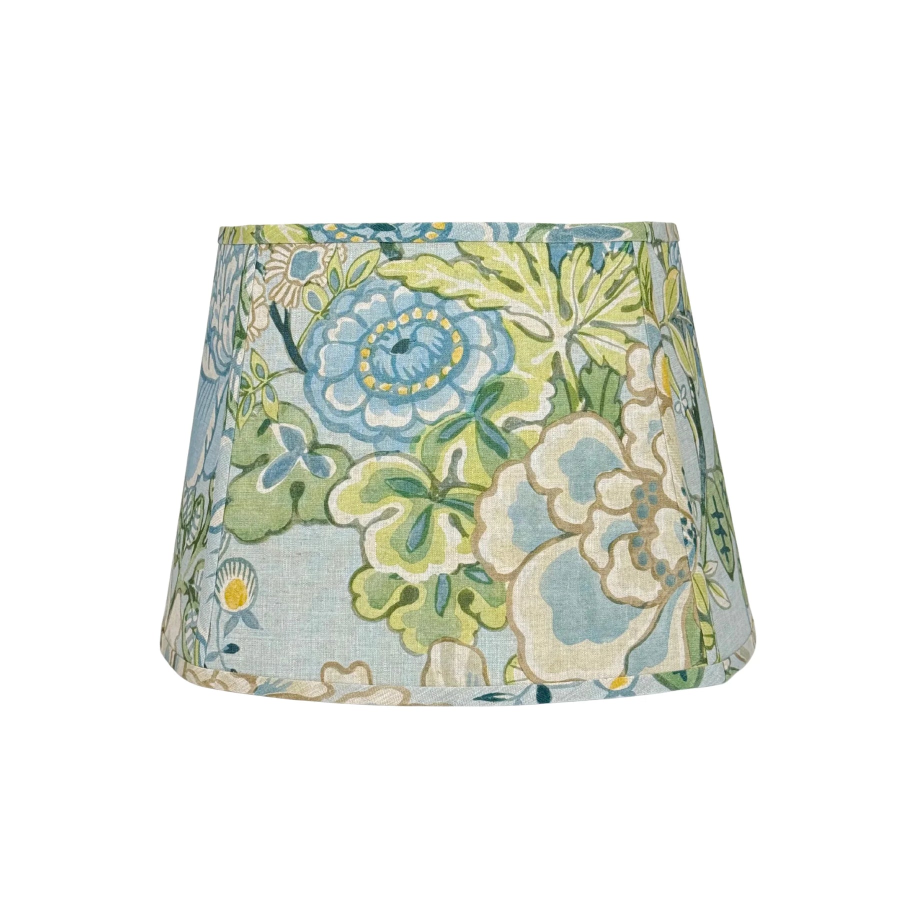 Handmade using Thibaut's Peony Garden in Spa Blue, this lampshade features a lush, stylized watercolor garden of fanciful peonies boldly outlined for a vibrant, graphic feel that bursts with color. Cool blue and cream blooms layered with teal and gold create a look that feels lively, fresh, and full of personality.