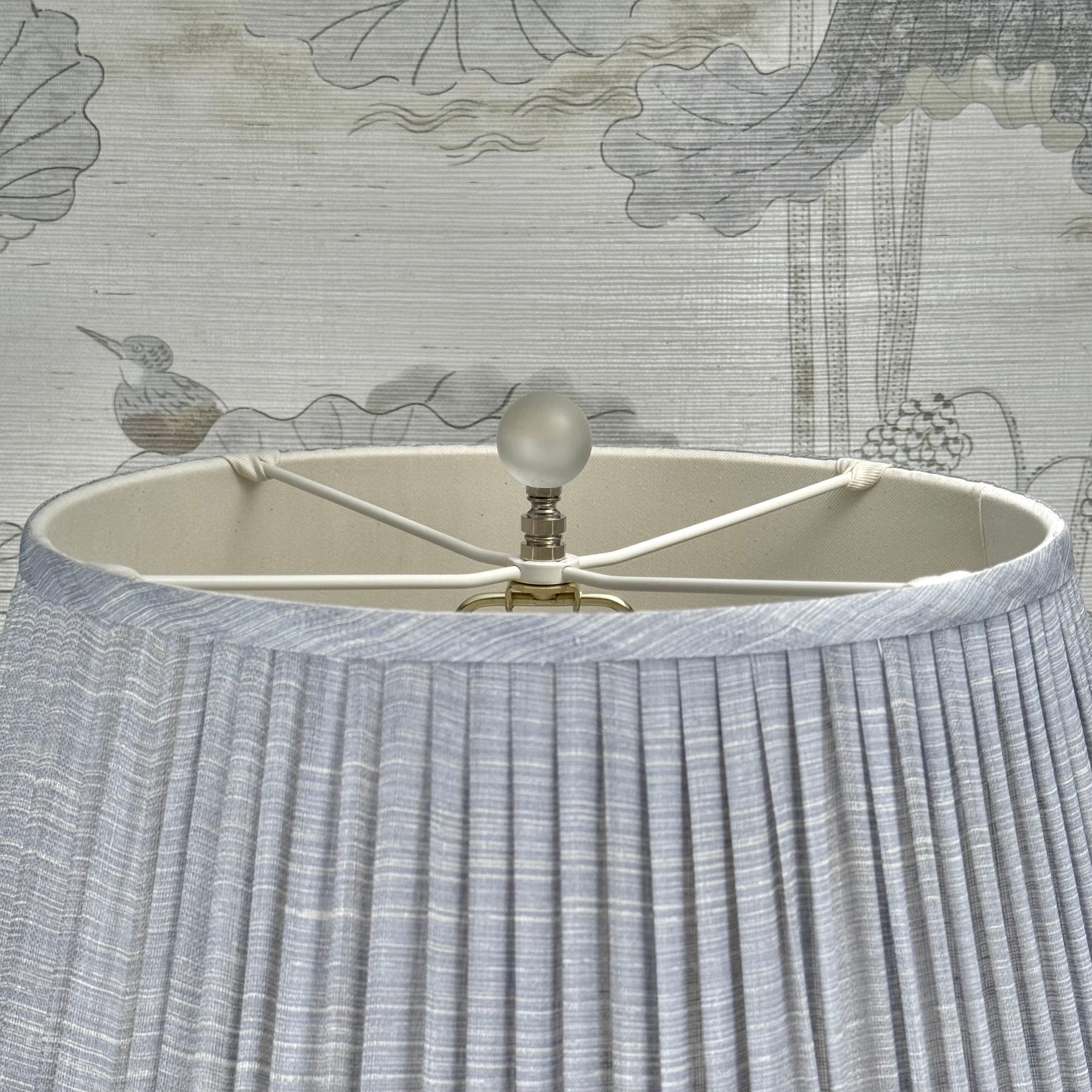 Crafted from frosted glass and set on a polished nickel base, this finial offers a soft, diffused glow and a clean, modern accent to any lamp.