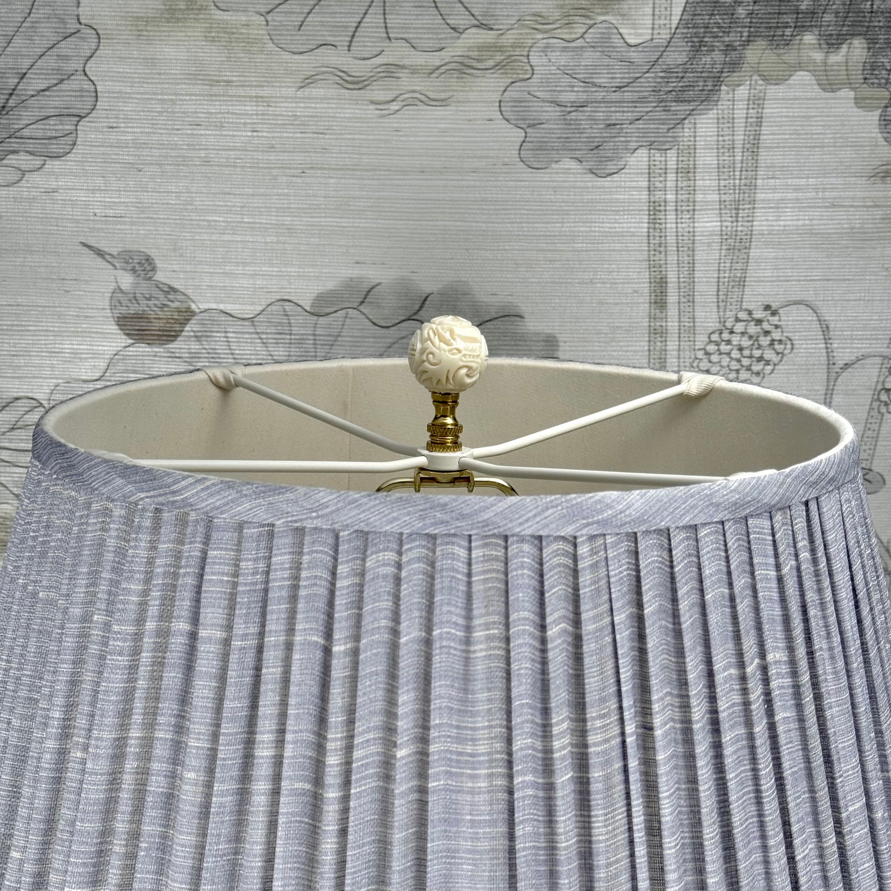 A white finial carved with the long life symbol and mounted on a brass base, adding a quiet decorative detail to any lamp.