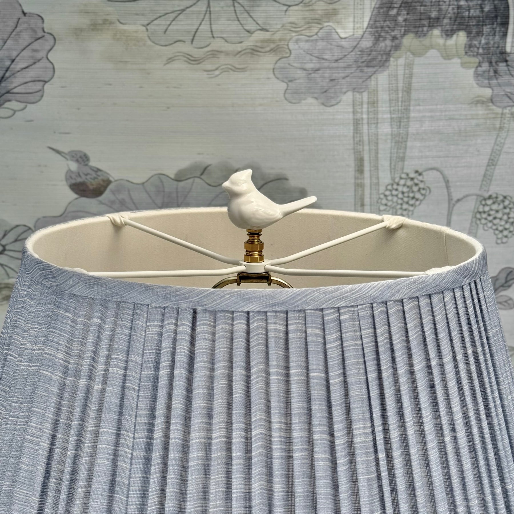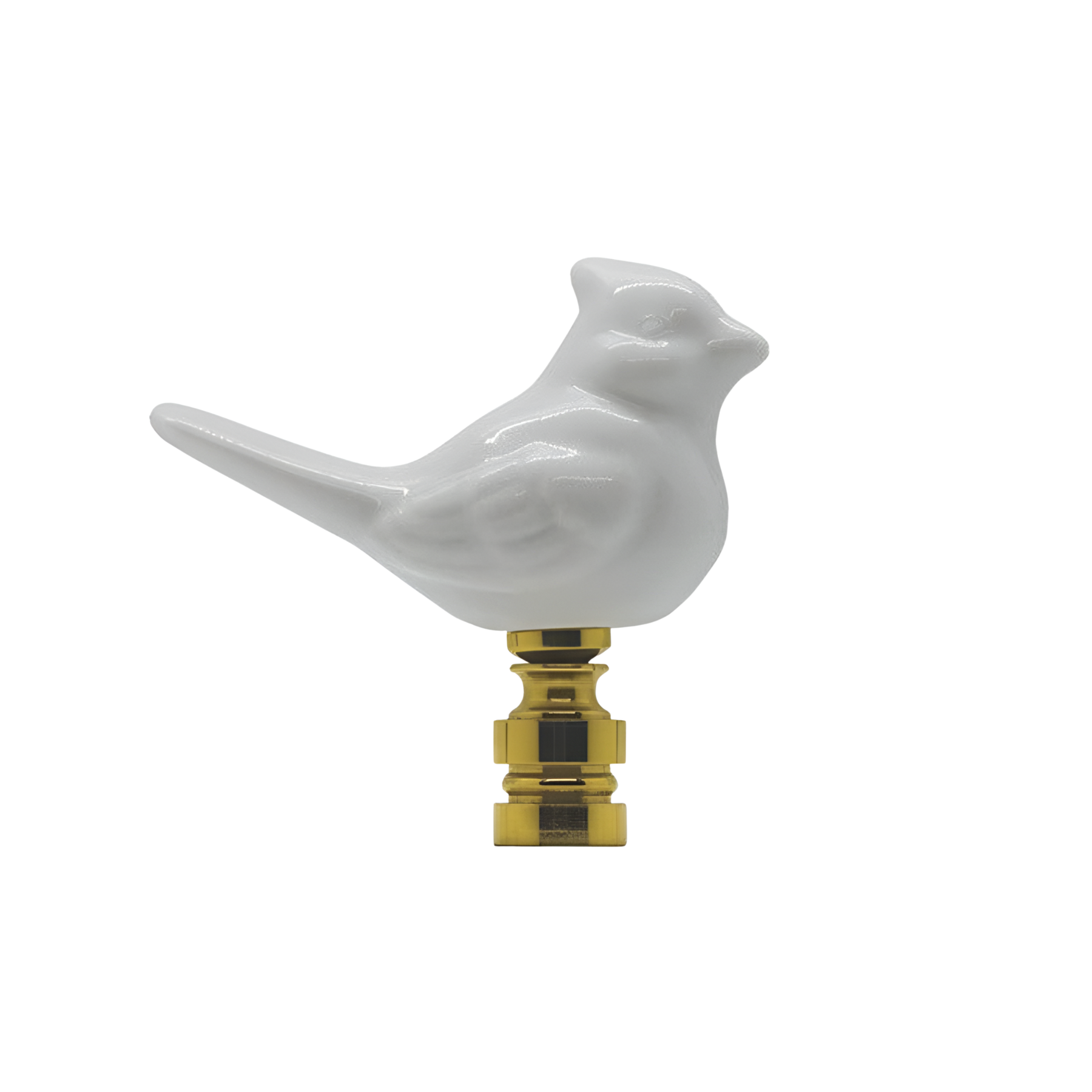 Glossy white porcelain bird on a polished brass base; a clean finishing touch.