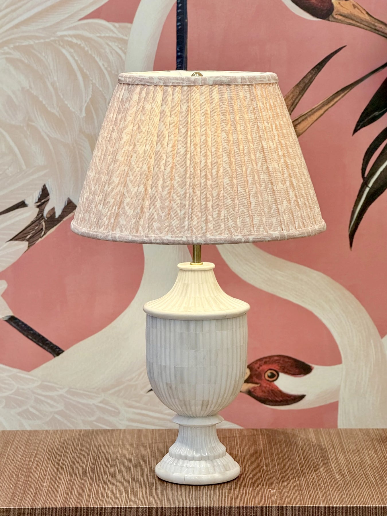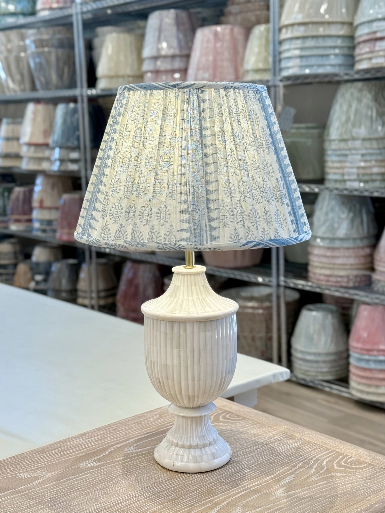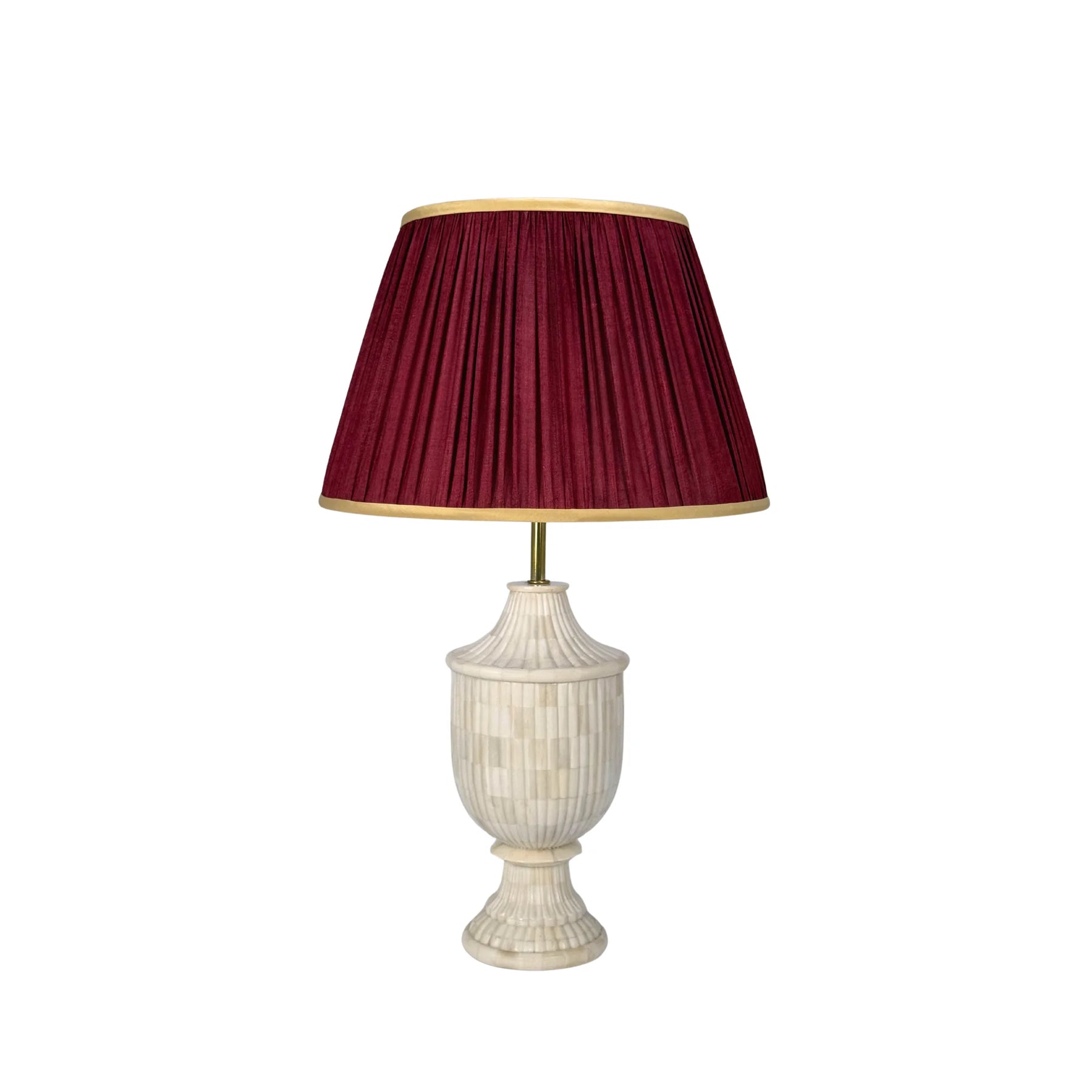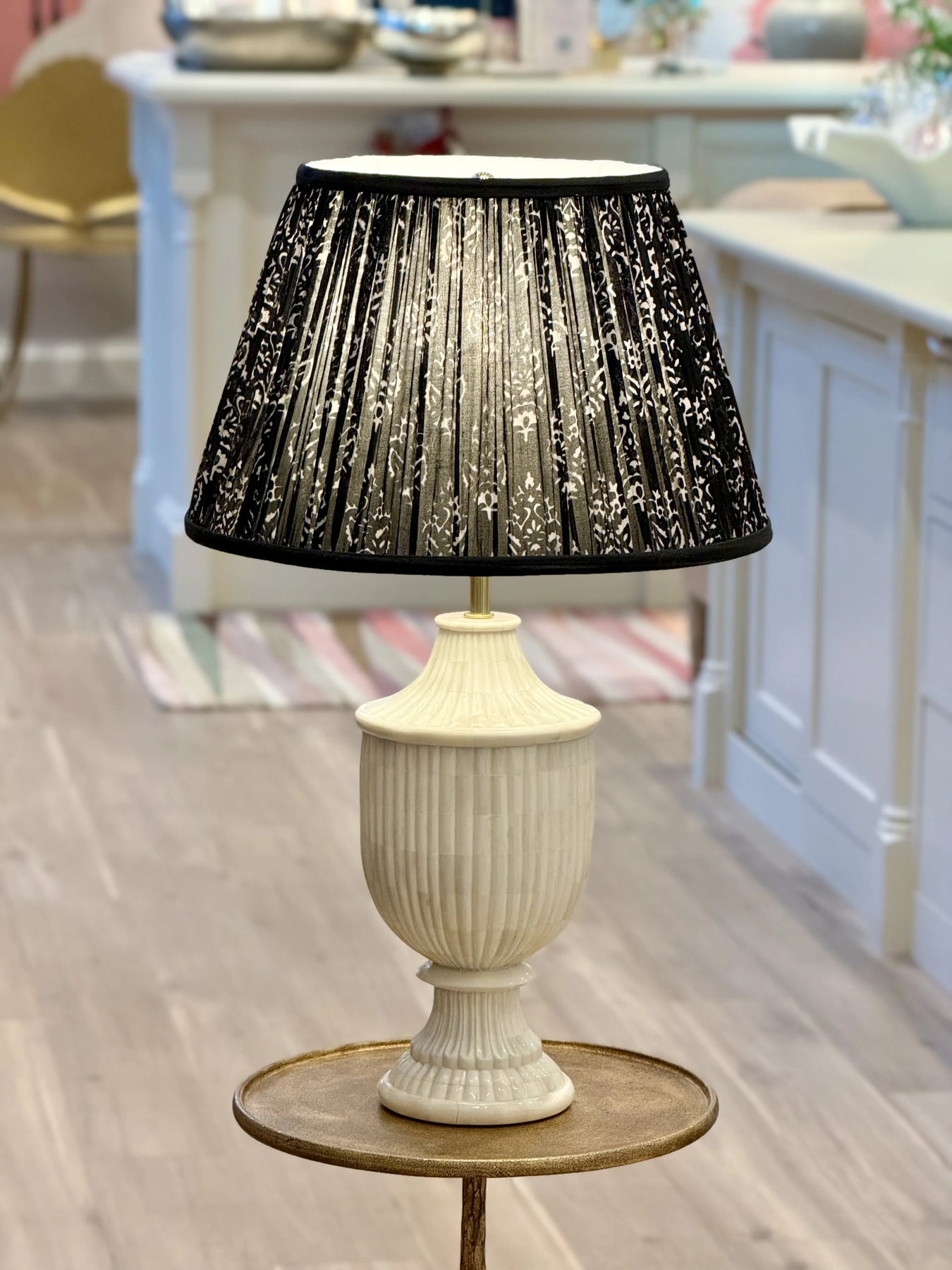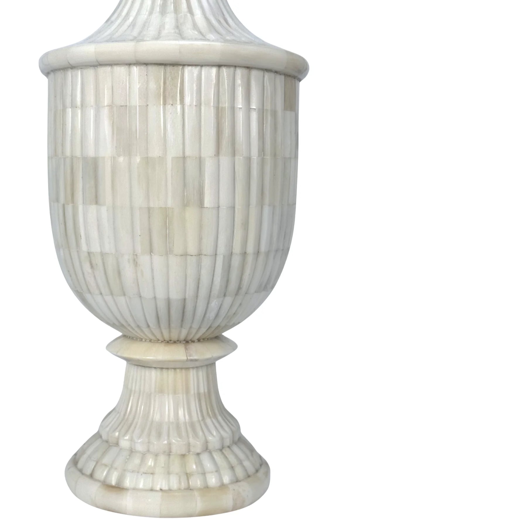 The Jaipur bone table lamp features a classic urn silhouette that brings texture and warmth to any space. Its rounded body and narrow foot create a balanced, graceful form, perfect for pairing with any of our lampshades. Each lamp is hand-carved from ethically sourced bone in India making every piece unique and full of natural character.