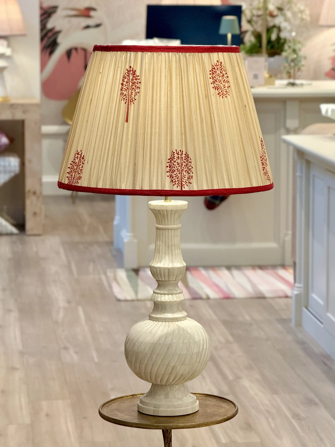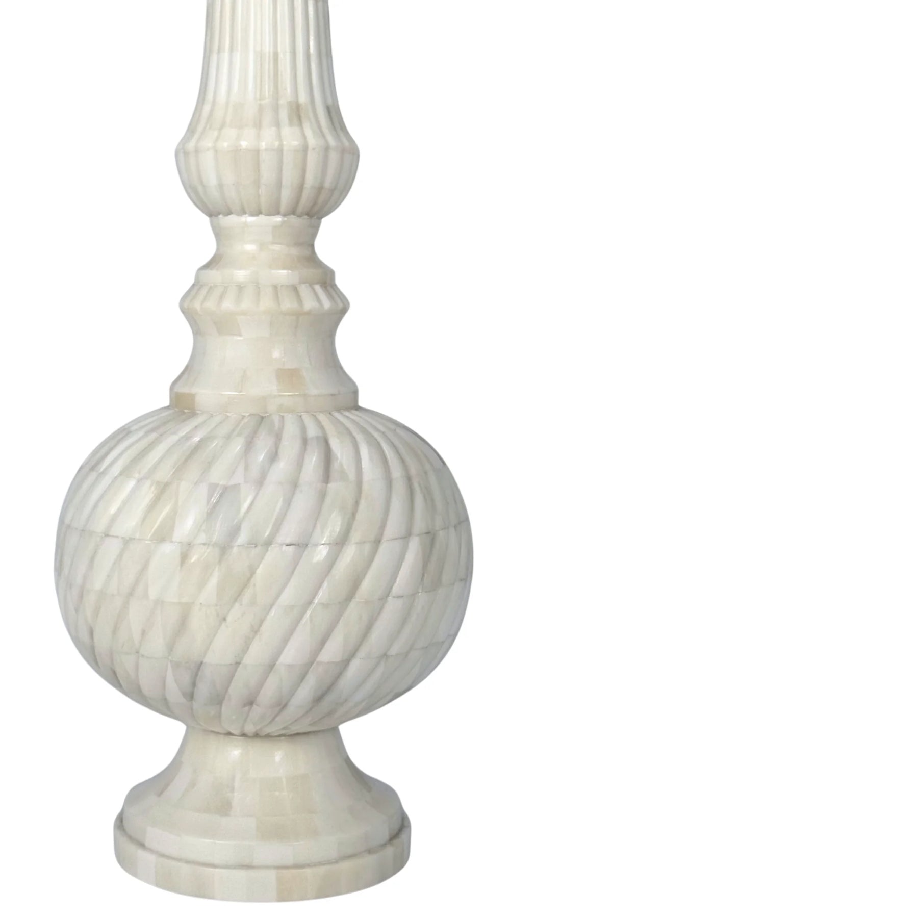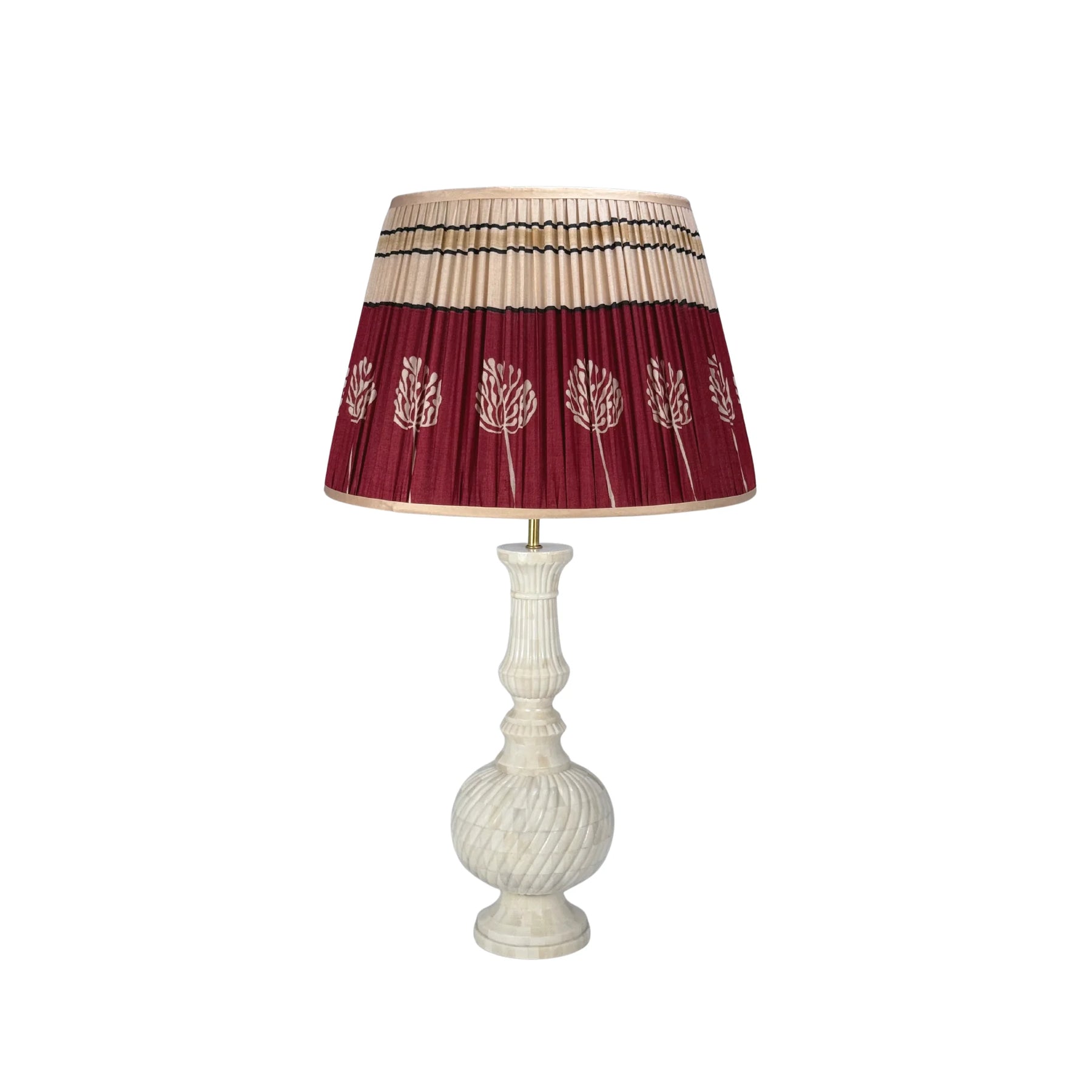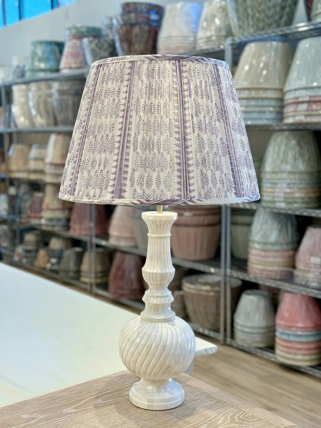 The Lotus bone table lamp features a tall silhouette with a fluted, rounded base that adds movement and gentle texture to any room. Its slender neck and carved detailing create a balanced profile, perfect for pairing with any of our lampshades. Each lamp is hand-carved from ethically sourced bone in India making every piece unique and full of natural character.