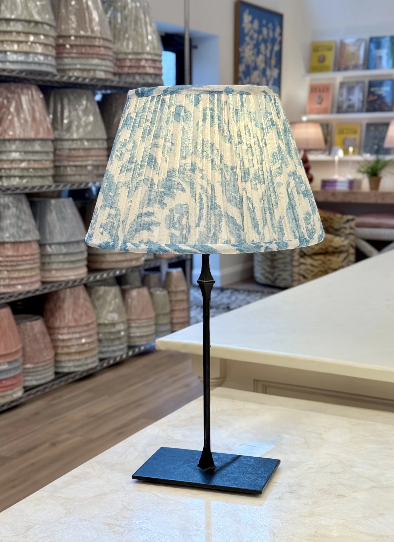 Fermoie Light Blue Marlborough Lampshade paired with Dauphine Bedside Lamp - Aged Iron