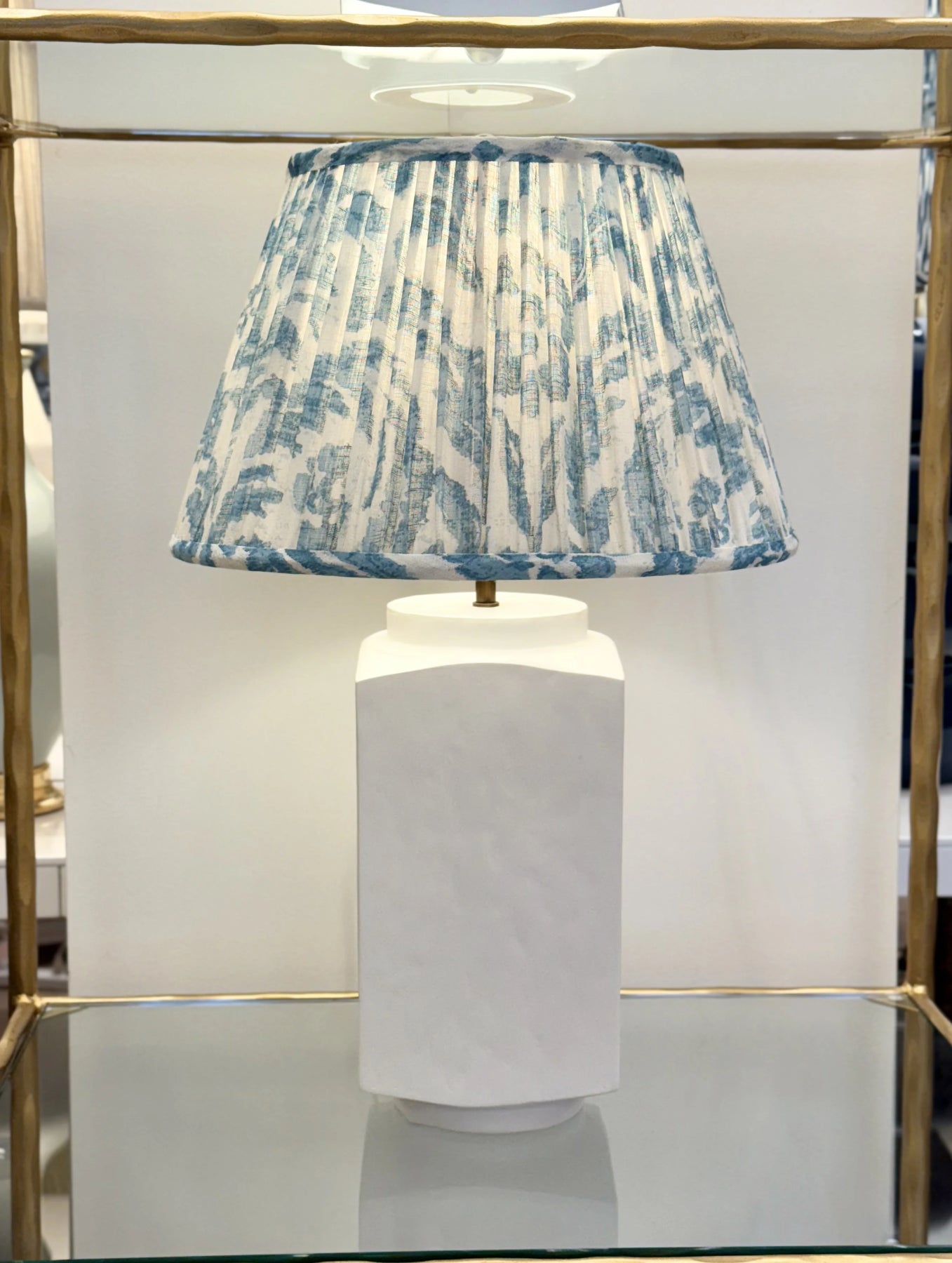Fermoie Light Blue Marlborough Lampshade paired with Julian Chichester - Small Linus White Gesso Table Lamp