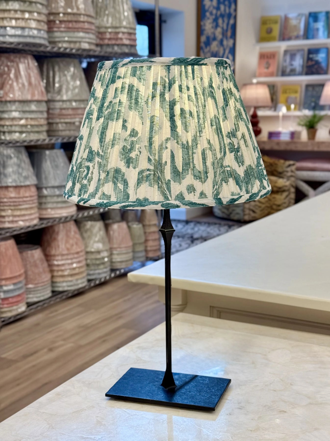 Fermoie Teal Marlborough Lampshade paired with Dauphine Bedside Lamp - Aged Iron