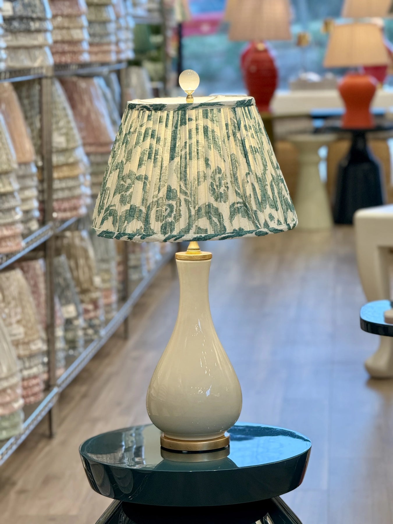 Fermoie Teal Marlborough Lampshade paired with Porcelain Ivory Dove Lamp
