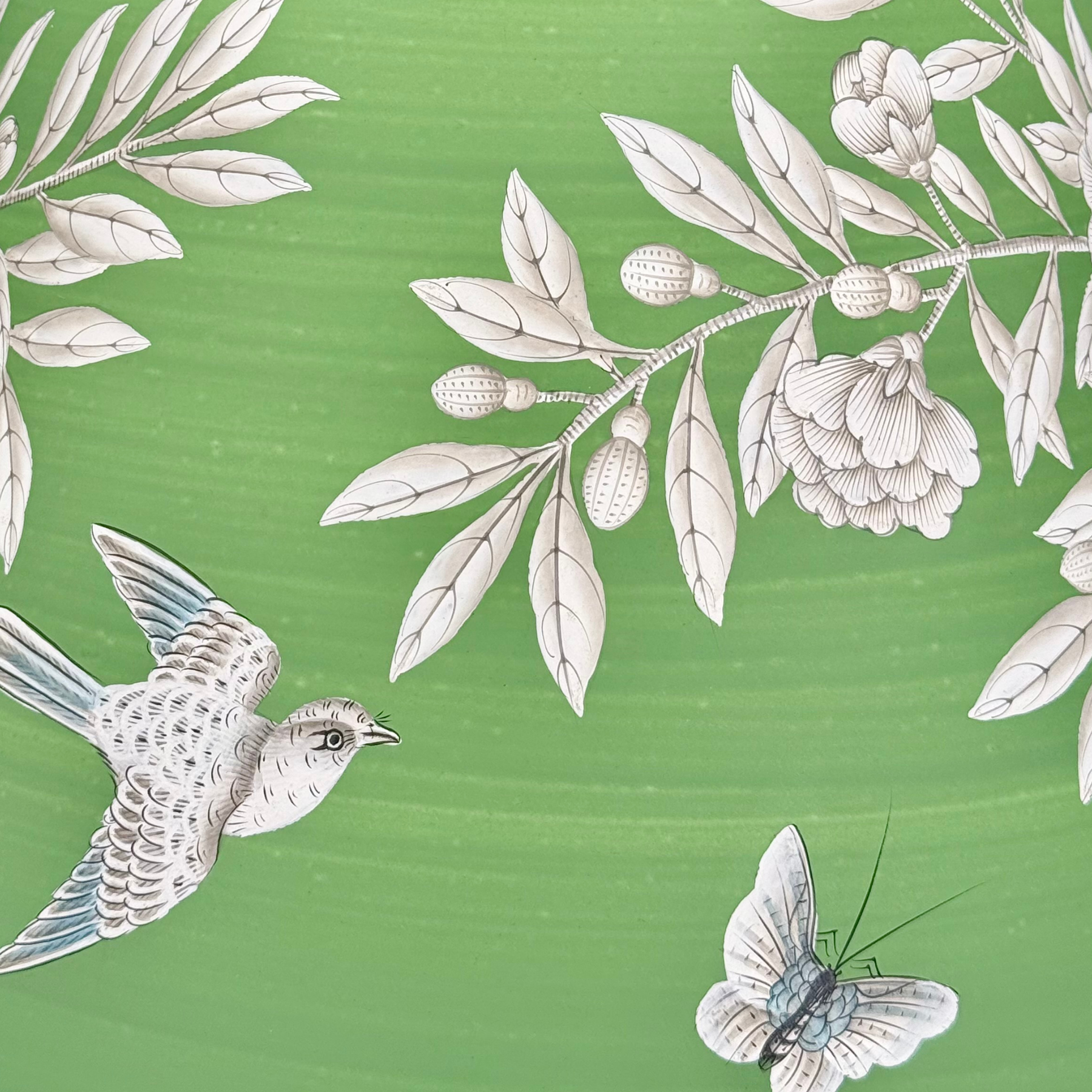 Inspired by Gracie’s iconic Greenfield wallpaper, each lampshade is a handpainted work of art featuring a design rooted in a 125-year tradition. Founded in 1898, Gracie is world-renowned for its chinoiserie panels, each meticulously painted by hand using techniques passed down through generations. Greenfield depicts flowering trees, birds, and butterflies on a green strié background — a timeless, painterly motif rarely seen outside of custom wall installations.