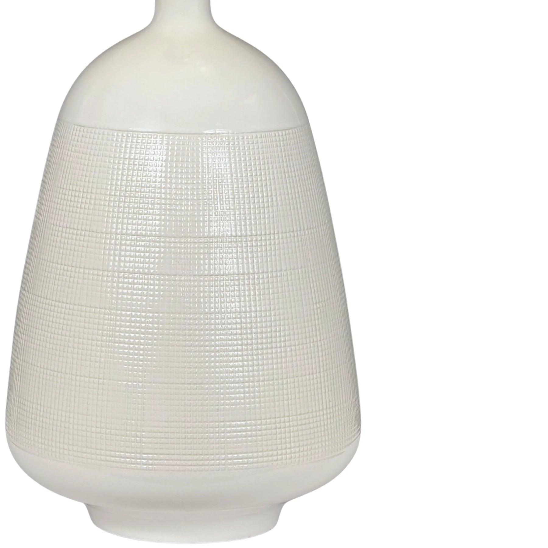 The Ornella Medium table lamp features a softly tapered, rounded silhouette that feels both modern and approachable. Its layered white glaze is finished with a subtle grid-like texture, adding depth and visual interest without overwhelming the design. The soft white tone makes it easy to pair with a wide range of shades and interiors.