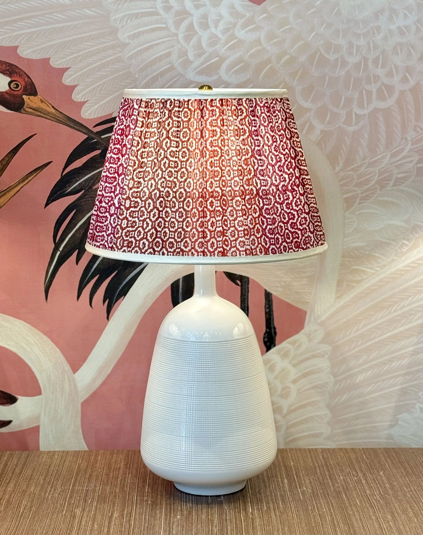 Ornella Medium Table Lamp in White paired with Red & Cream Sari Lampshade with Cream Silk Trim