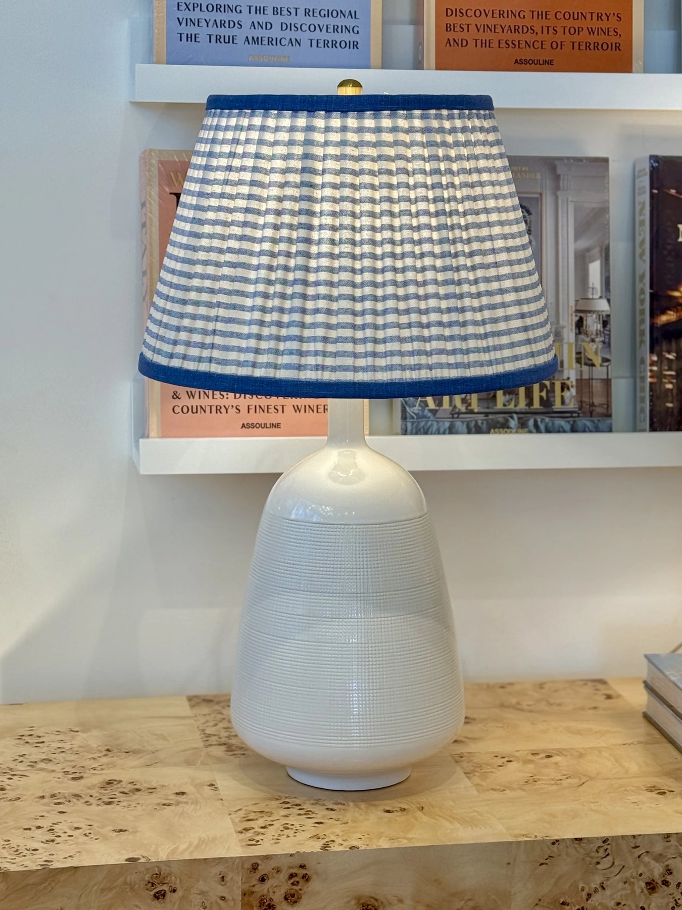 Ornella Medium Table Lamp in White Paired with Rosanna Lonsdale Blue Striped Lampshade