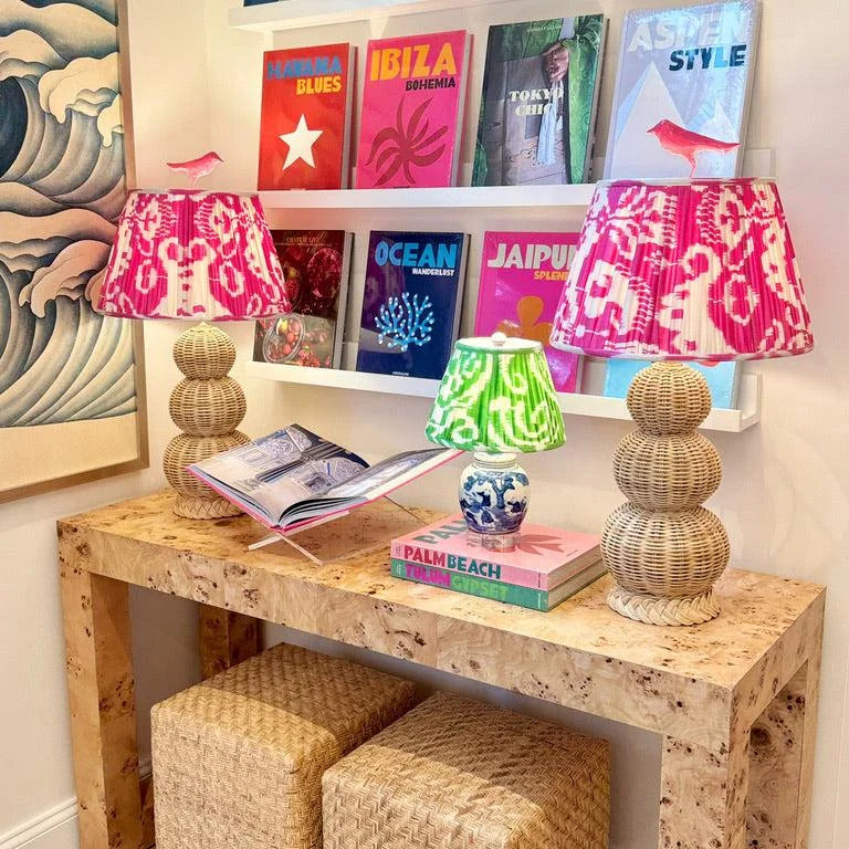 Rooted in Southeast Asian traditions dating back over 6,000 years, ikat textiles originated in Indonesia and the Middle East. Our ikat lampshade fabrics are crafted in Uzbekistan using hand-dyed threads and traditional weaving techniques.