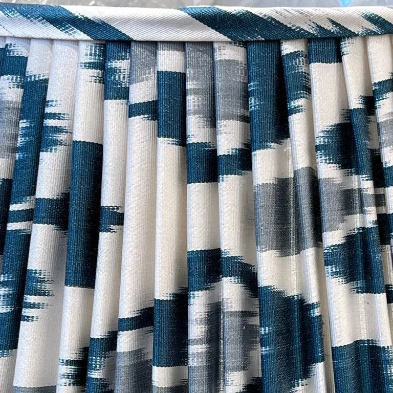 Close up gathered empire lampshade in Blue & Ivory hand-loomed silk Ikat