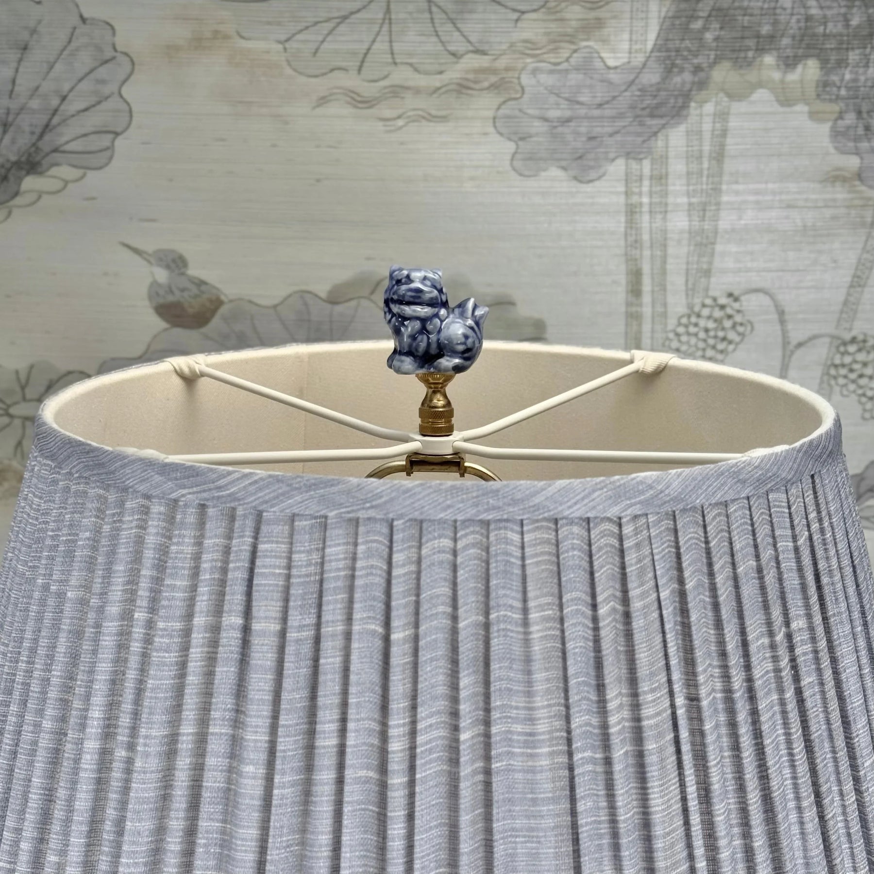 Blue Foo Dog lamp finial styled with a Fermoie strie lampshade on a Paul Schneider Athens ceramic lamp