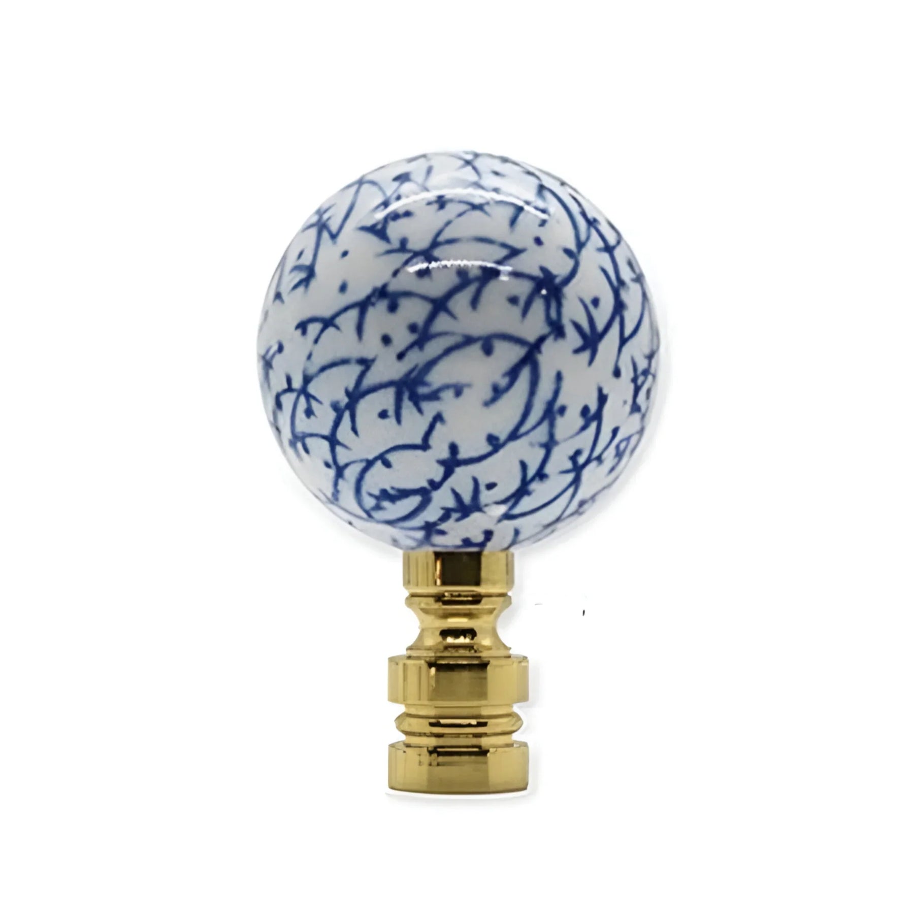 Hand-painted white porcelain sphere with cobalt linework on a polished brass base; clean and classic, with a tailored pop of pattern.