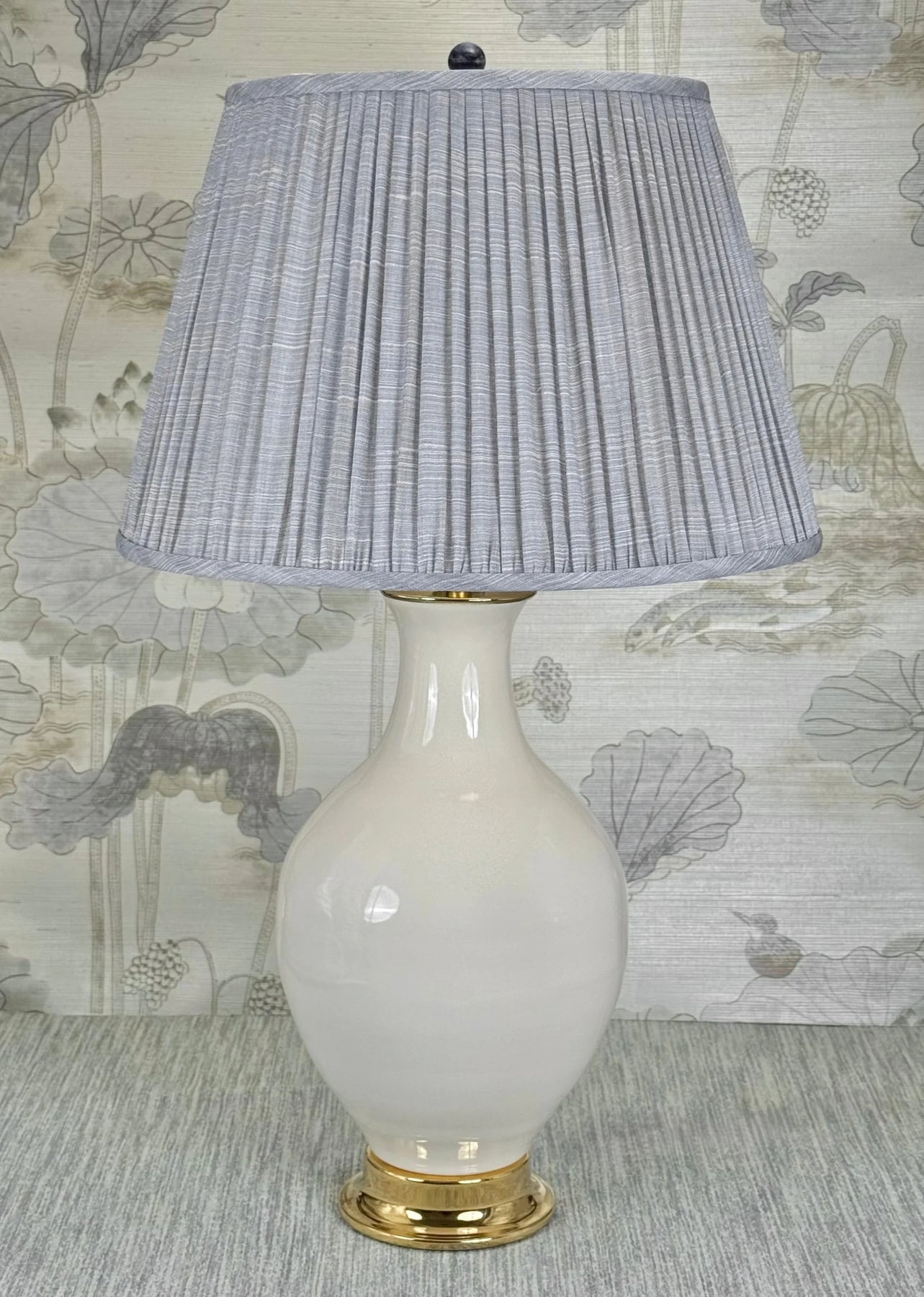 Blue Sodalite Stone Ball Finial styled with a Fermoie strie lampshade on a Paul Schneider Athens ceramic lamp