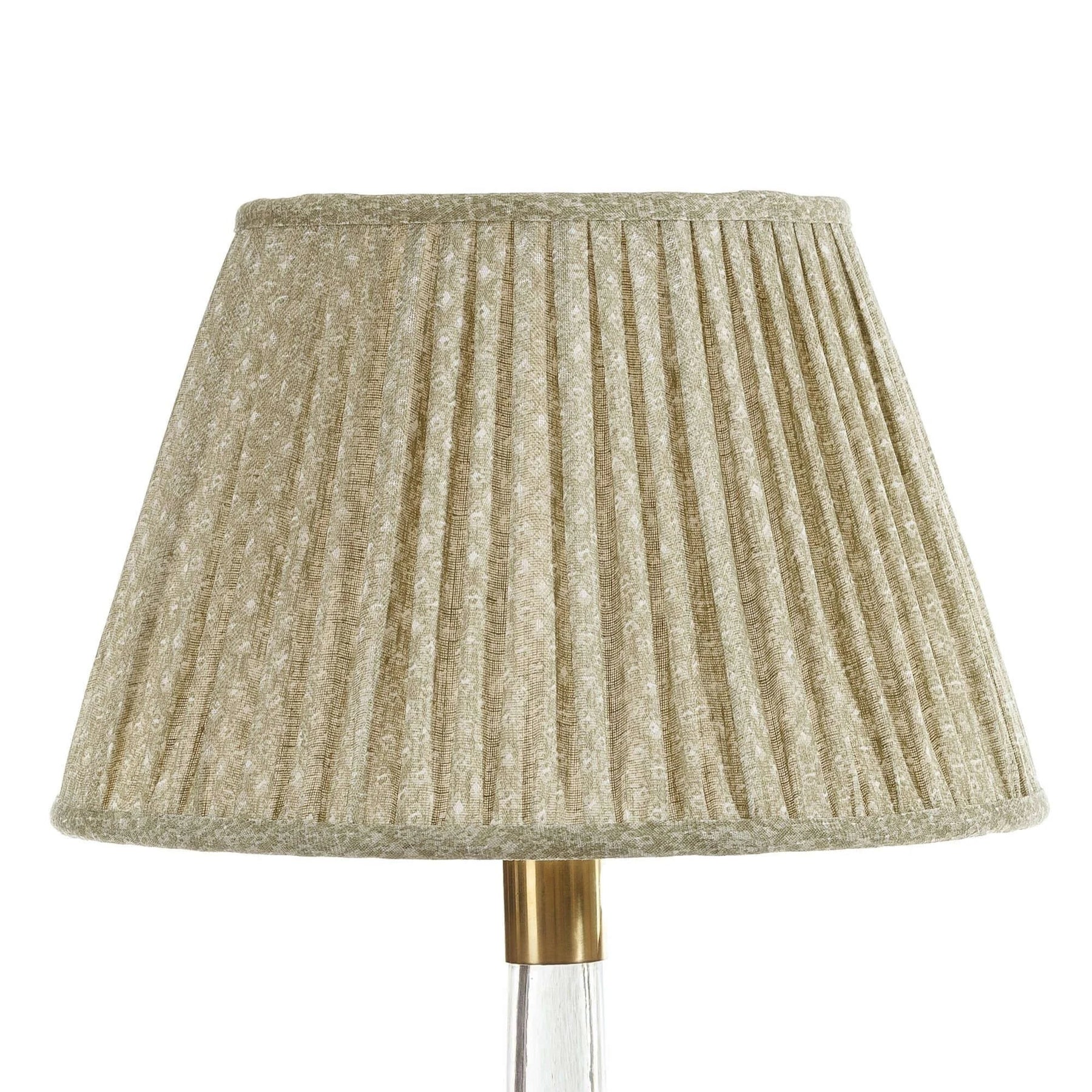 Handcrafted in England, each Green Figured lampshade is created using Fermoie fabric in a textured pale green made from natural dyes, layered with a delicate self colored pattern. This shade has an empire silhouette and is constructed from premium 100% linen, with a cream cotton lining matching the frame color.