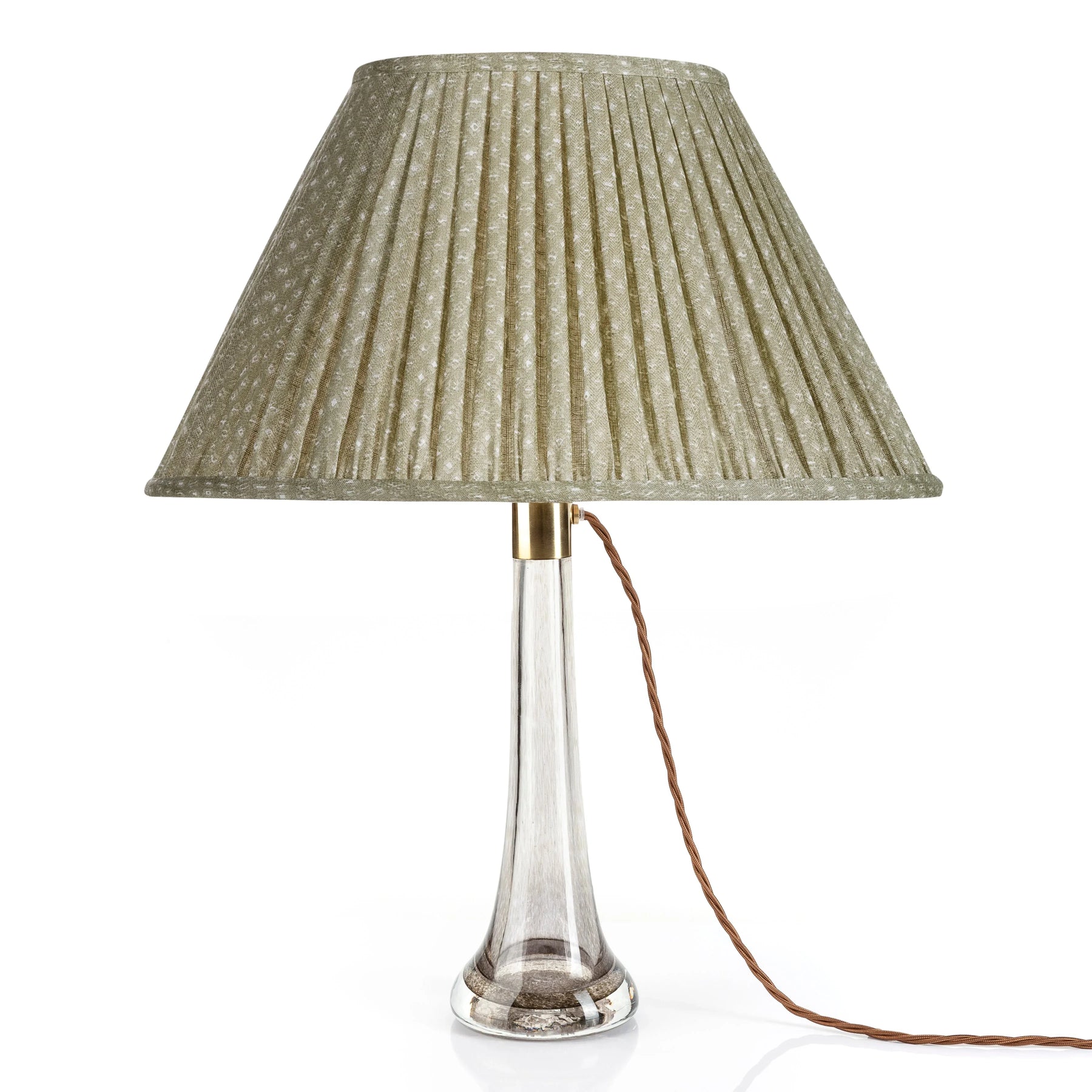 Handcrafted in England, each Green Figured lampshade is created using Fermoie fabric in a textured pale green made from natural dyes, layered with a delicate self colored pattern. This shade has an oval silhouette and is constructed from premium 100% linen, with a cream cotton lining matching the frame color.