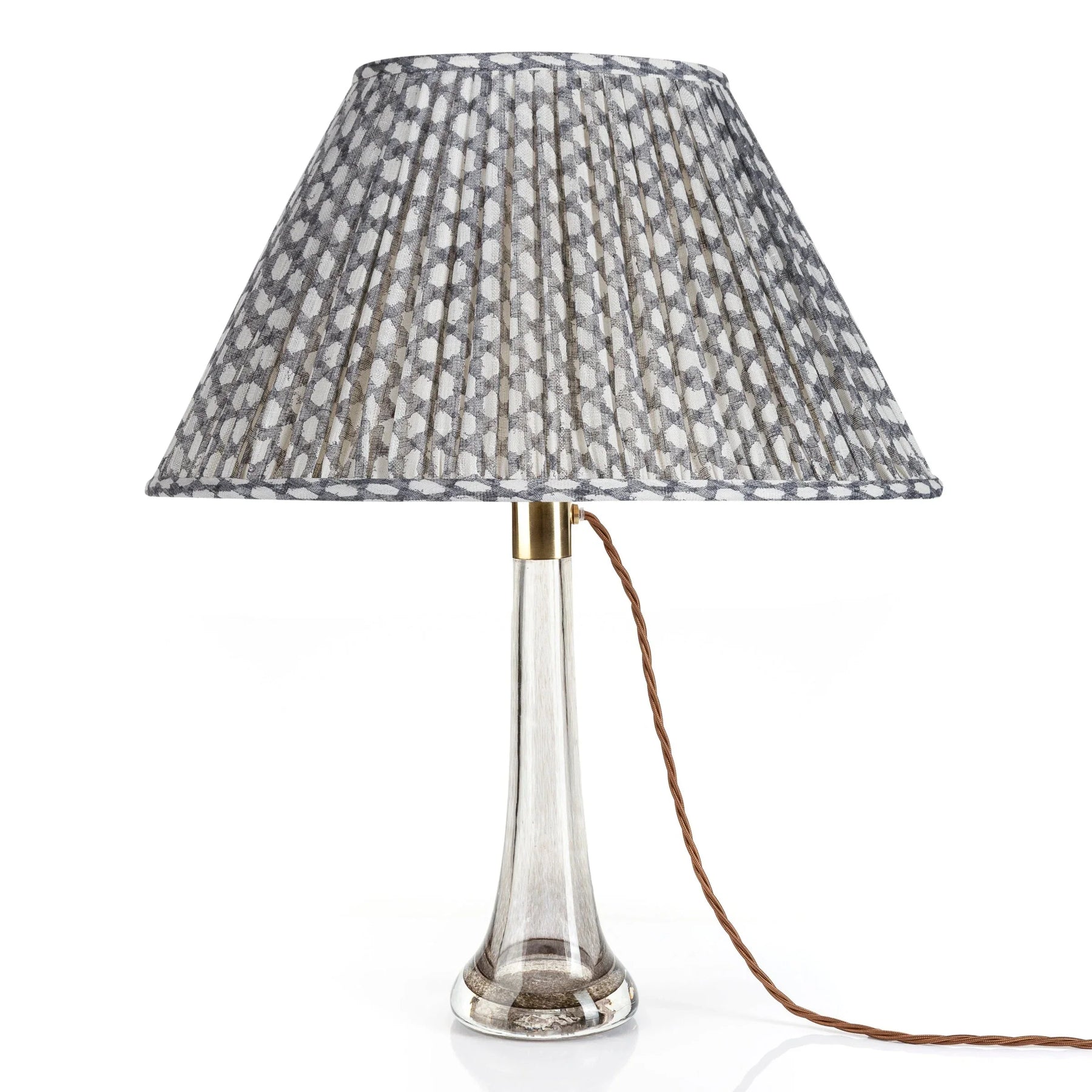 Handcrafted in England, each Grey Wicker lampshade is printed with Fermoie's unique re-drawing of a traditional wickerwork pattern, using natural dyes. This shade has an oval silhouette and is constructed from premium 100% linen, with a cream cotton lining matching the frame color.