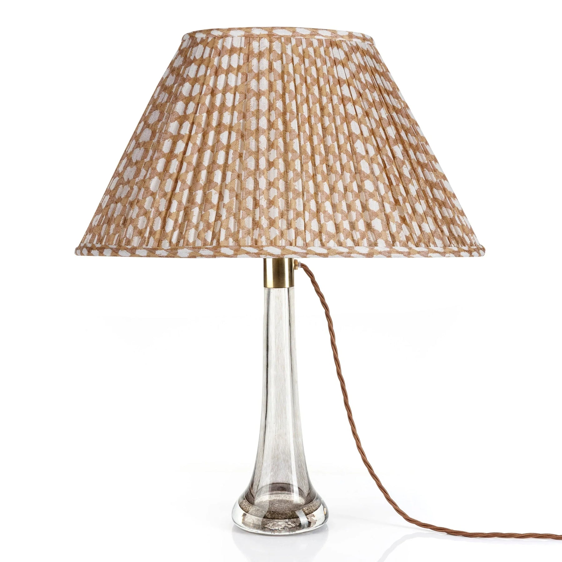 Handcrafted in England, each Nut Brown Wicker lampshade is printed with Fermoie's unique re-drawing of a traditional wickerwork pattern, using natural dyes. This shade has an oval silhouette and is constructed from premium 100% linen, with a cream cotton lining matching the frame color.