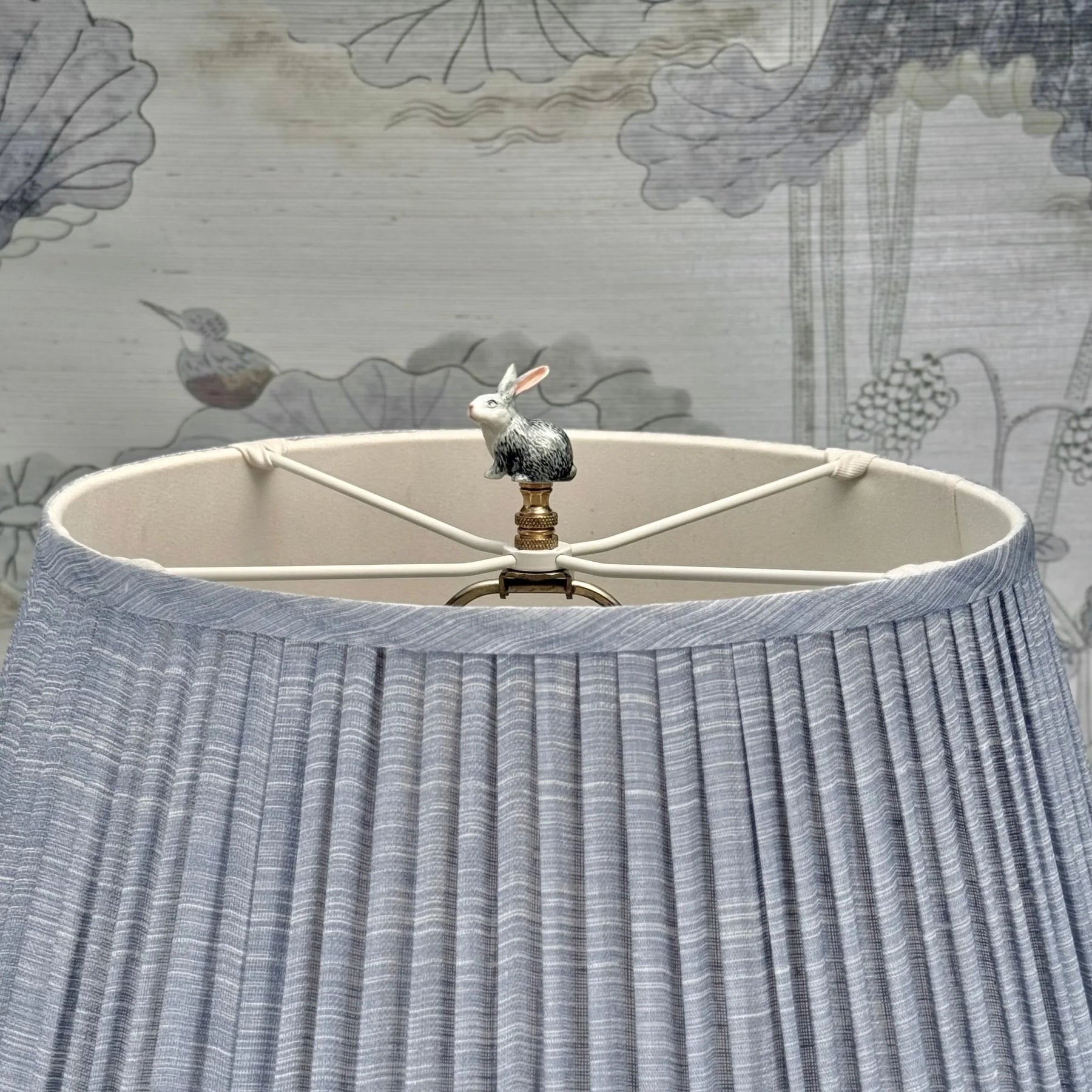 Gray Rabbit  lamp finial styled with a Fermoie strie lampshade on a Paul Schneider Athens ceramic lamp.