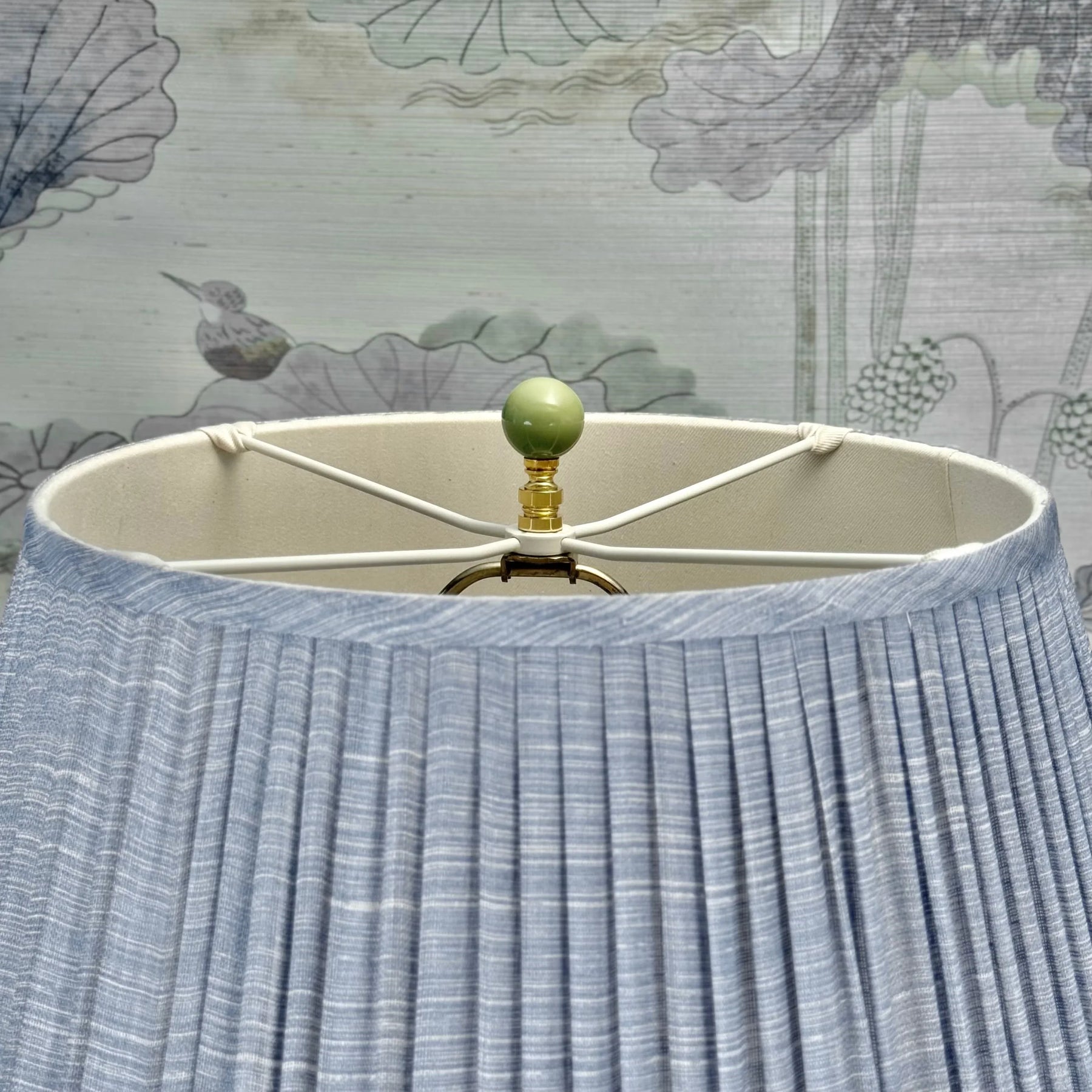 A hemlock green ceramic ball finial rests atop a polished brass base, offering a subtle yet refined finishing detail.