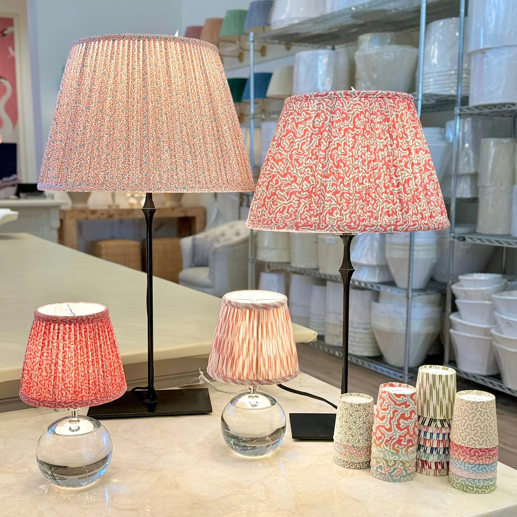Enlarged from a tiny fragment of 19th century patchwork, Ian Sanderson's Pinto design has a modern twist. Printed in orange and blue on off-white 100% cotton, each classic empire shade is printed, pleated and gathered by hand in England.