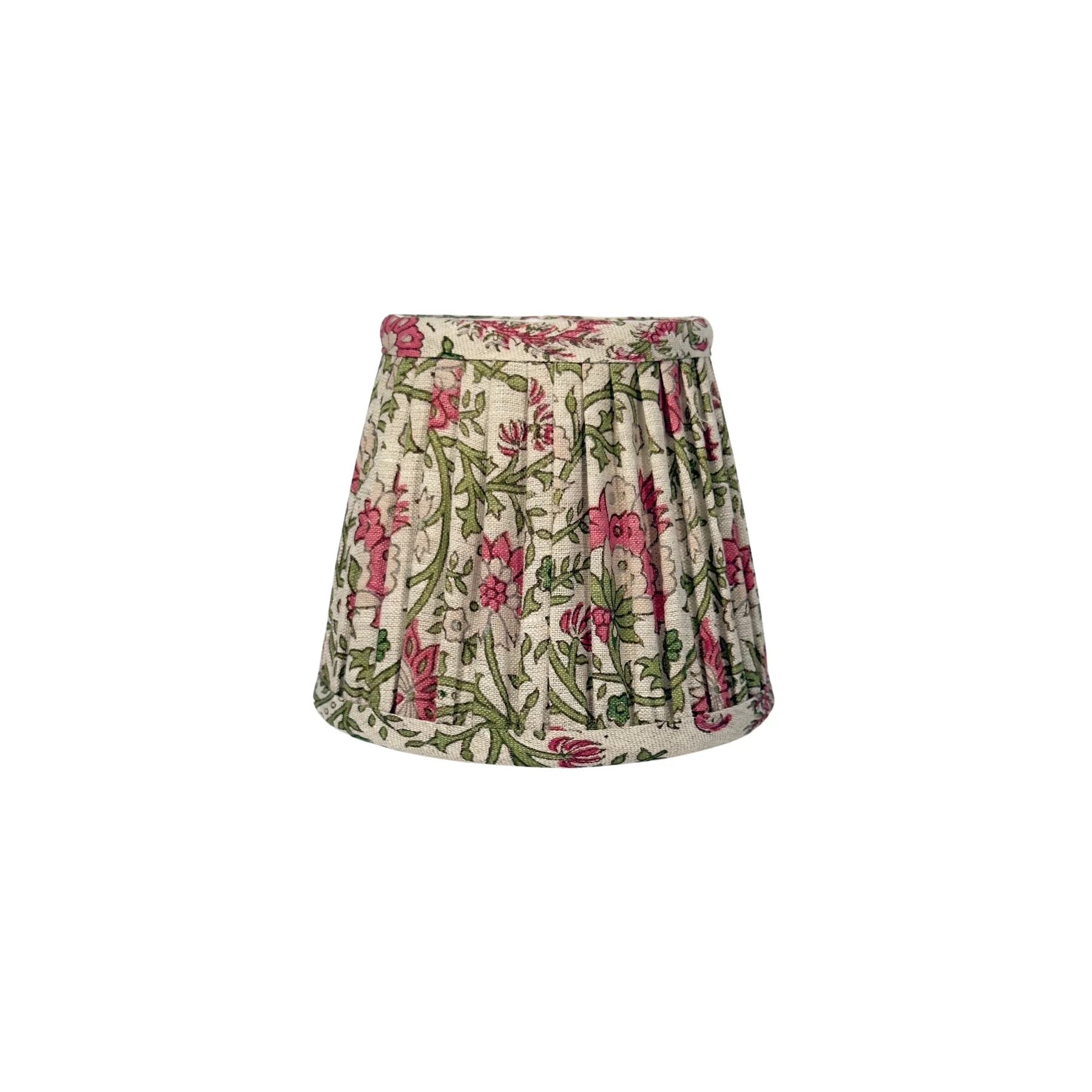 Ian Sanderson's Mallow design is a testament to the Indian art of hand block printing, showcasing intricate patterns influenced by centuries old cultures and traditions. The traditional, trailing design of flowers and foliage is printed in deep shades green and pink on off-white 100% linen. Each classic empire shade is printed, pleated and gathered by hand in England.