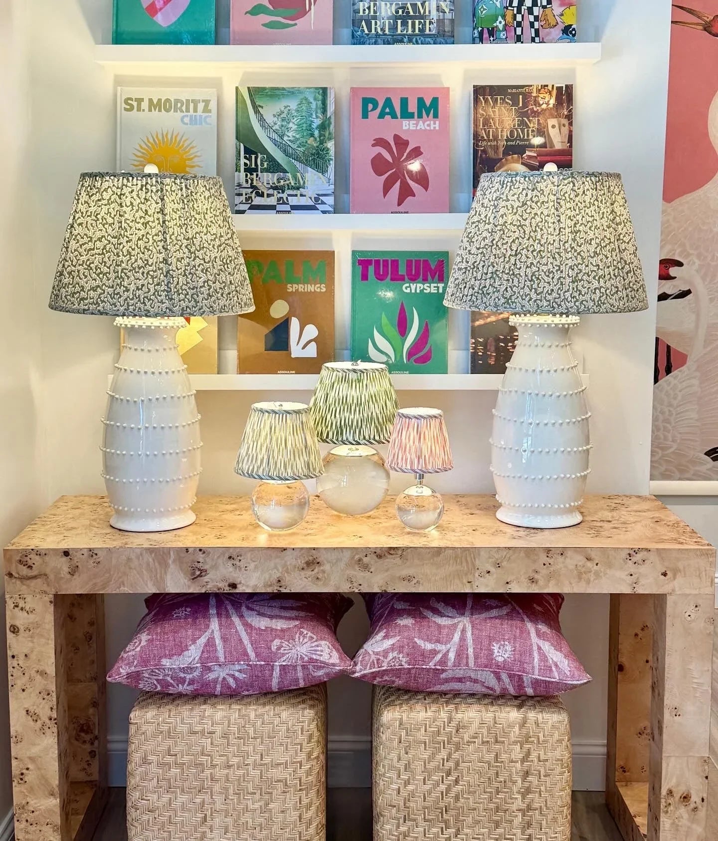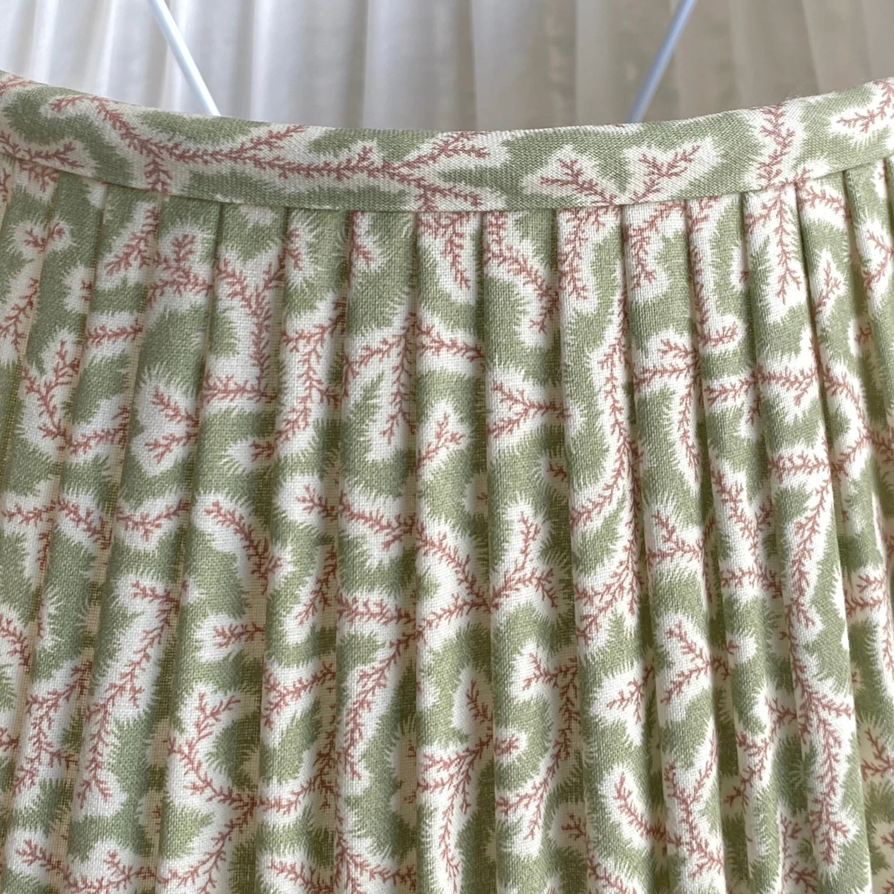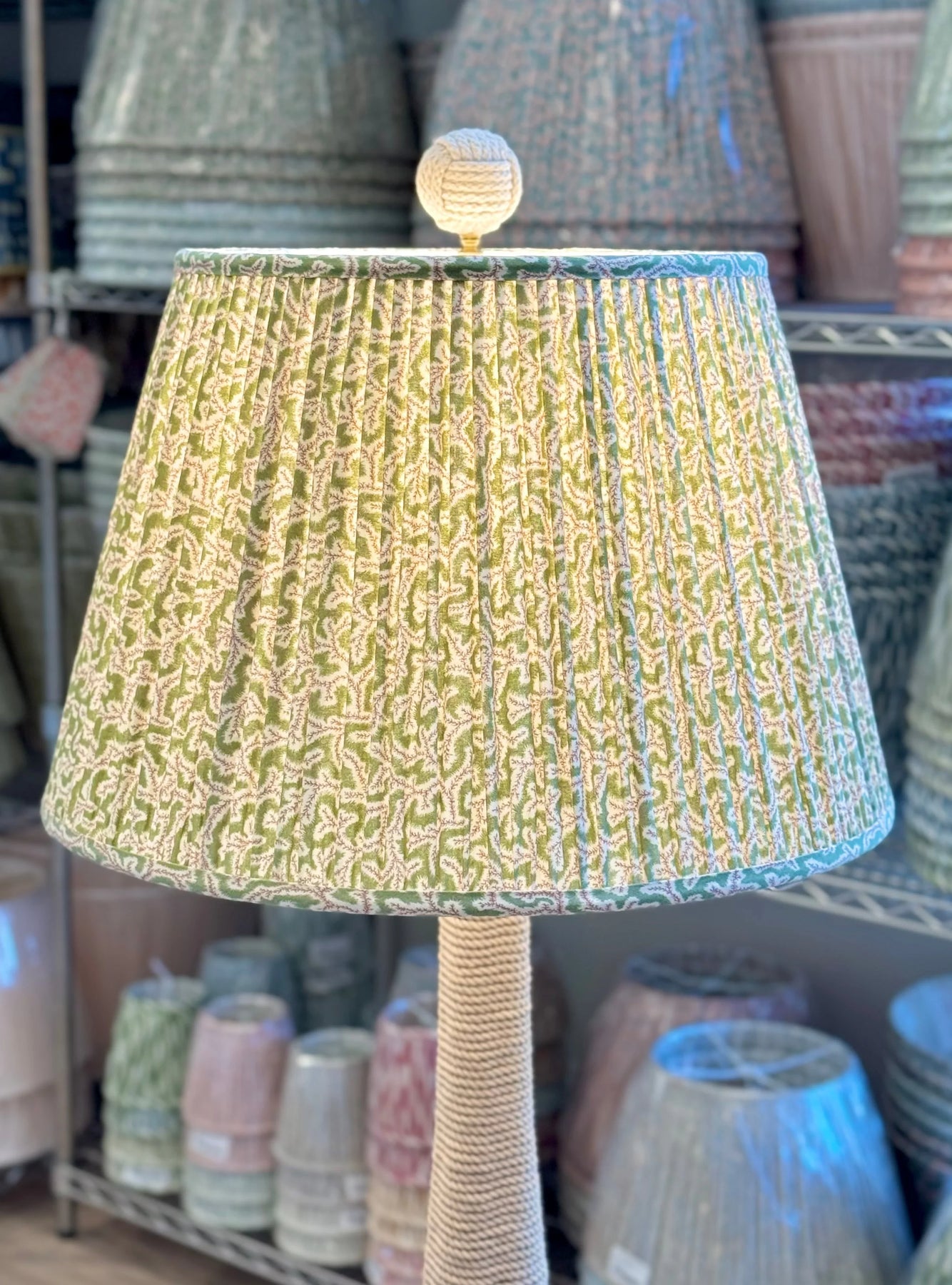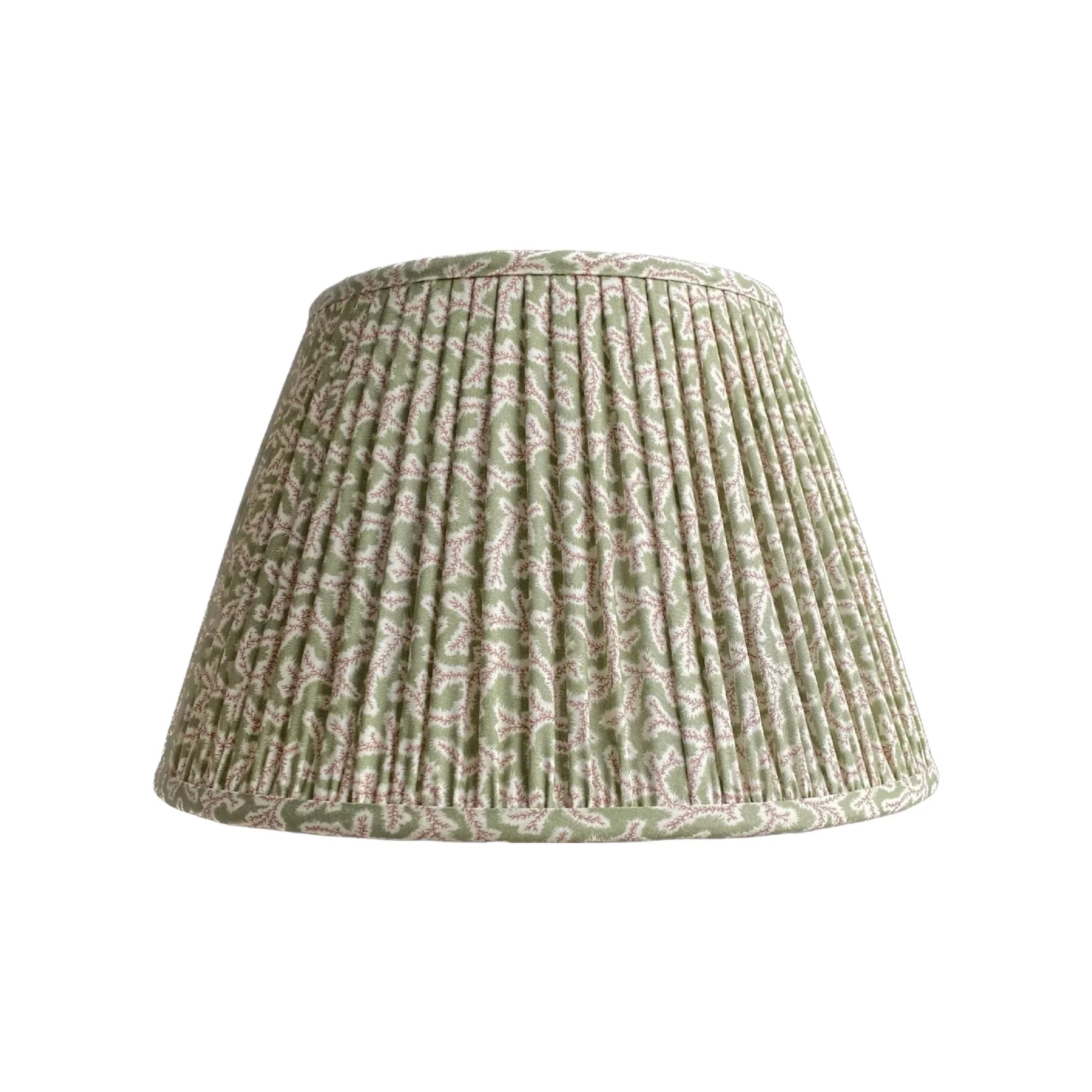 Ian Sanderson's Dulcie design is a seaweed-inspired classic, with great movement and detail. Printed in green and burgundy on off-white 100% cotton, each classic empire shade is printed, pleated and gathered by hand in England.