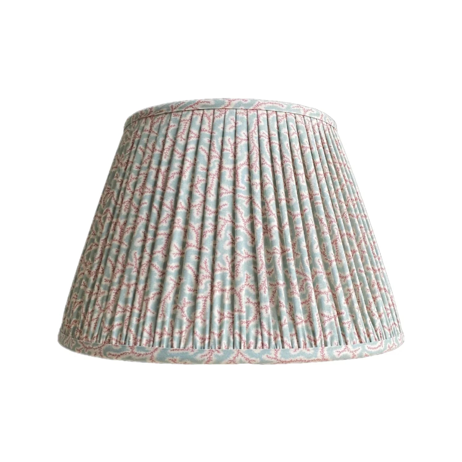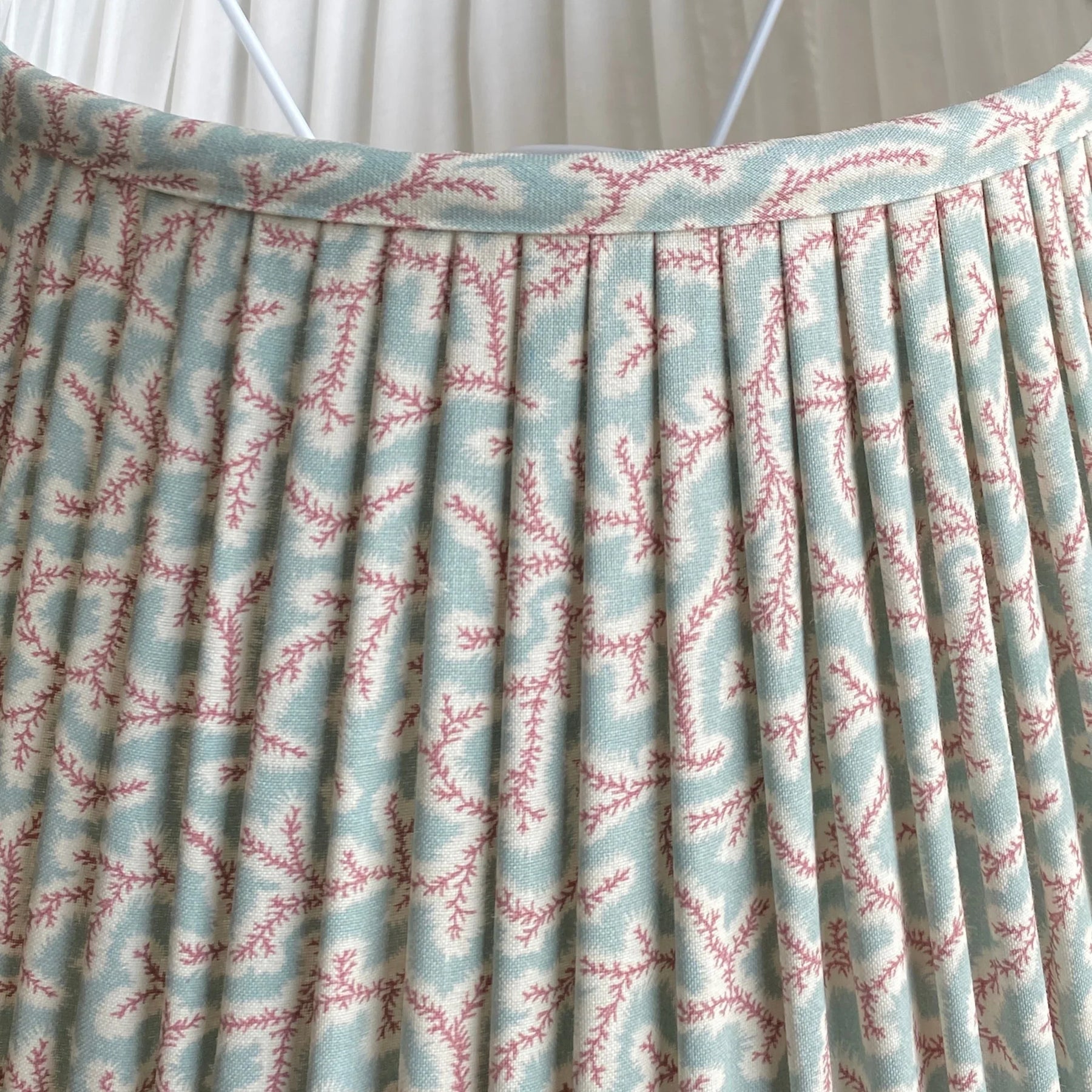 Ian Sanderson's Dulcie design is a seaweed-inspired classic, with great movement and detail. Printed in aqua and burgundy on off-white 100% cotton, each classic empire shade is printed, pleated and gathered by hand in England.
