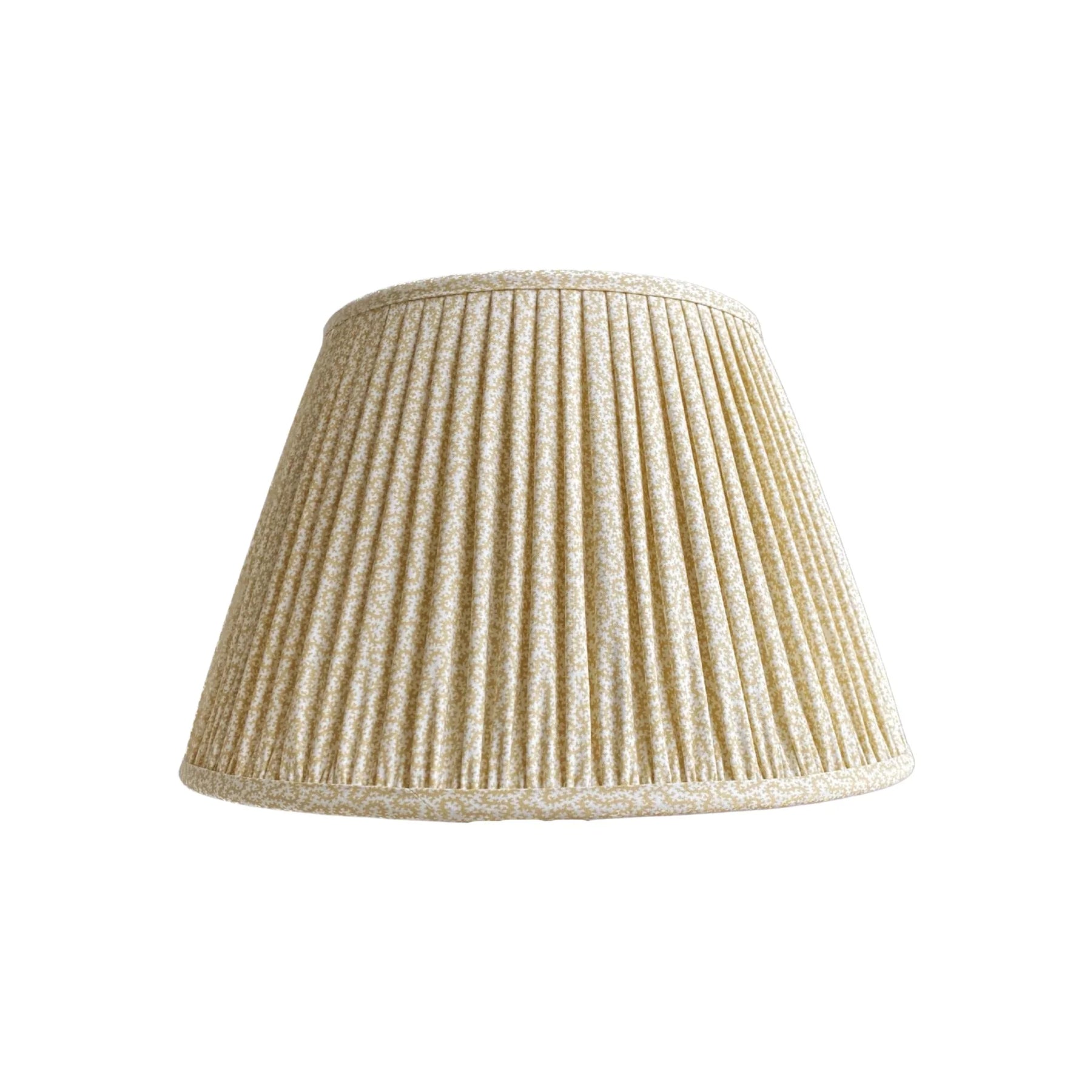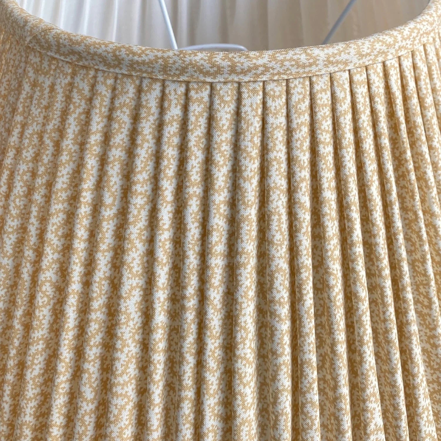 Petra is a surprisingly contemporary print from the Ian Sanderson archive. Its small scale pattern is beautifully presented in a muted yellow palette on off-white 100% cotton. Each classic empire shape shade is printed, pleated and gathered by hand in England.