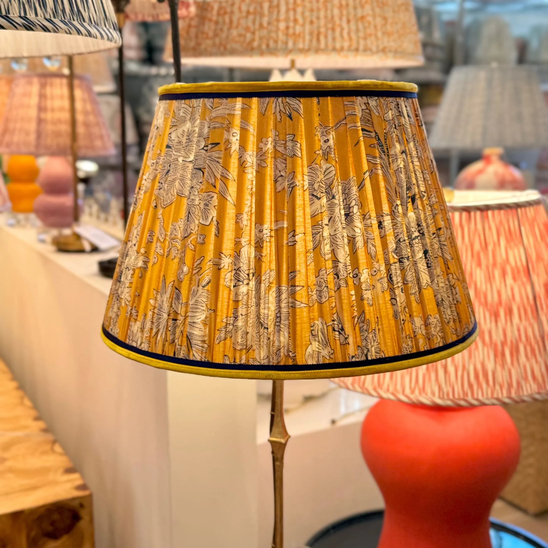 Tan & Navy Flower on Mustard Block Print Lampshade with Velvet & Grosgrain Trim