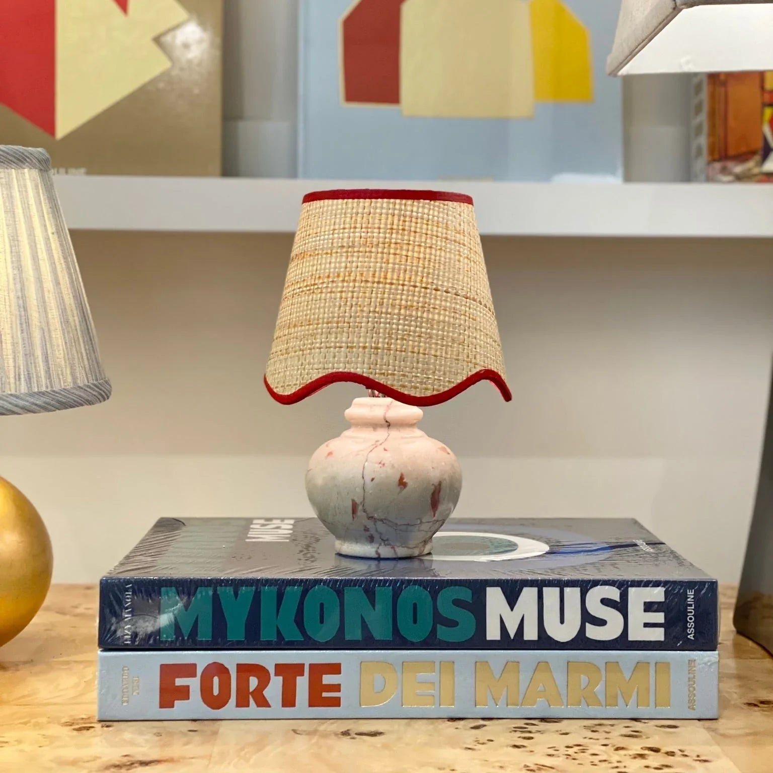 Woven from natural raffia and finished with a scalloped edge wrapped in vibrant red trim, this chandelier shade strikes the perfect balance of texture and color. Its soft, organic look brings warmth to any space and a tailored detail to lighting designs.