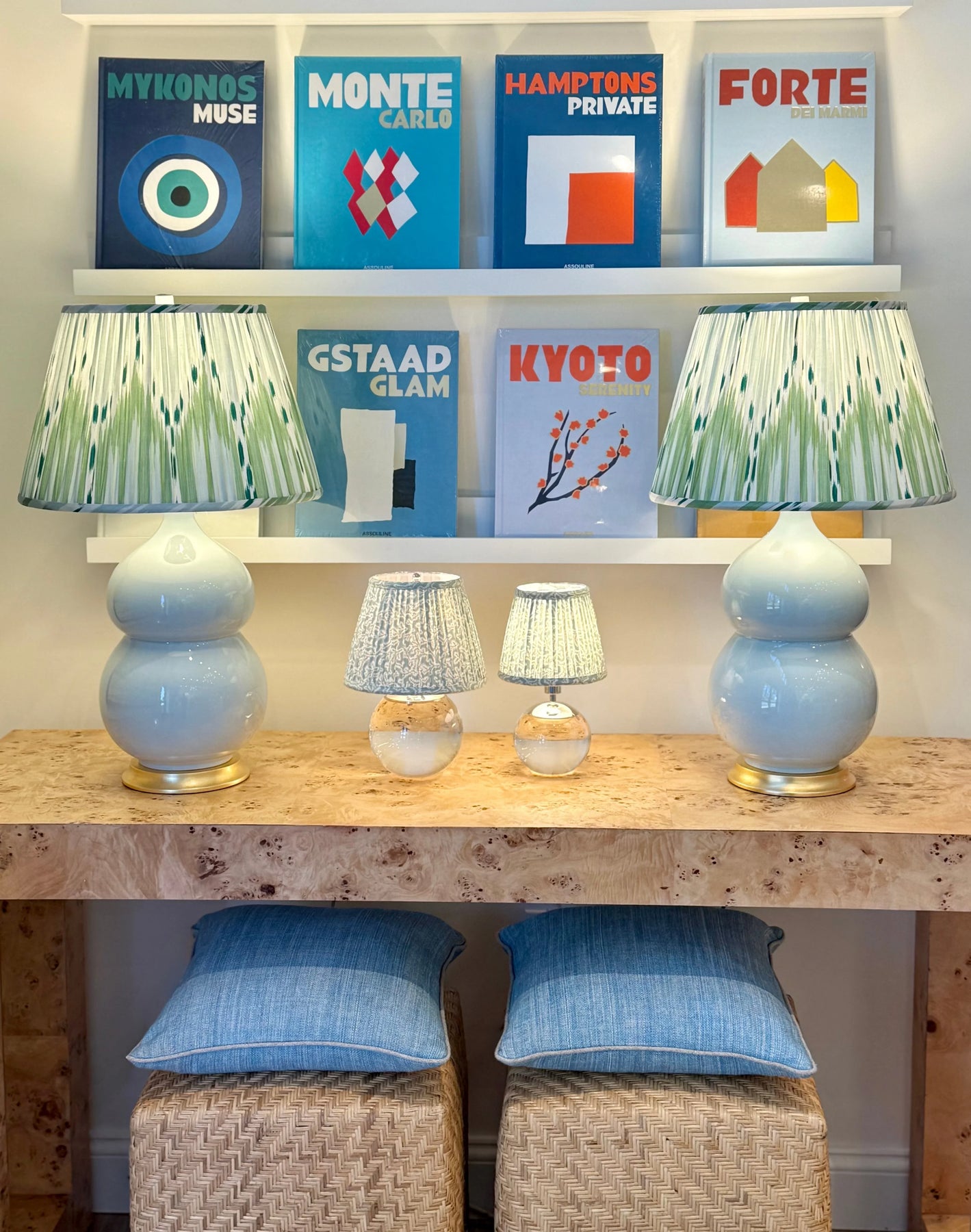 This handcrafted lampshade showcases Schumacher's "Bukhara Ikat" fabric in Blue Mineral and Leaf Green. Known for its luxurious textiles, Schumacher blends graphic artistry with premium materials, creating an eye-catching design that adds playful sophistication to any room.